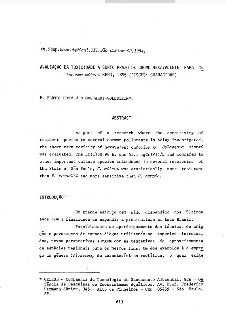 Avaliação da toxicidade a curto prazo de cromo hexavalente para colossoma mitrei BERG, 1895 (Pisces: characidade)