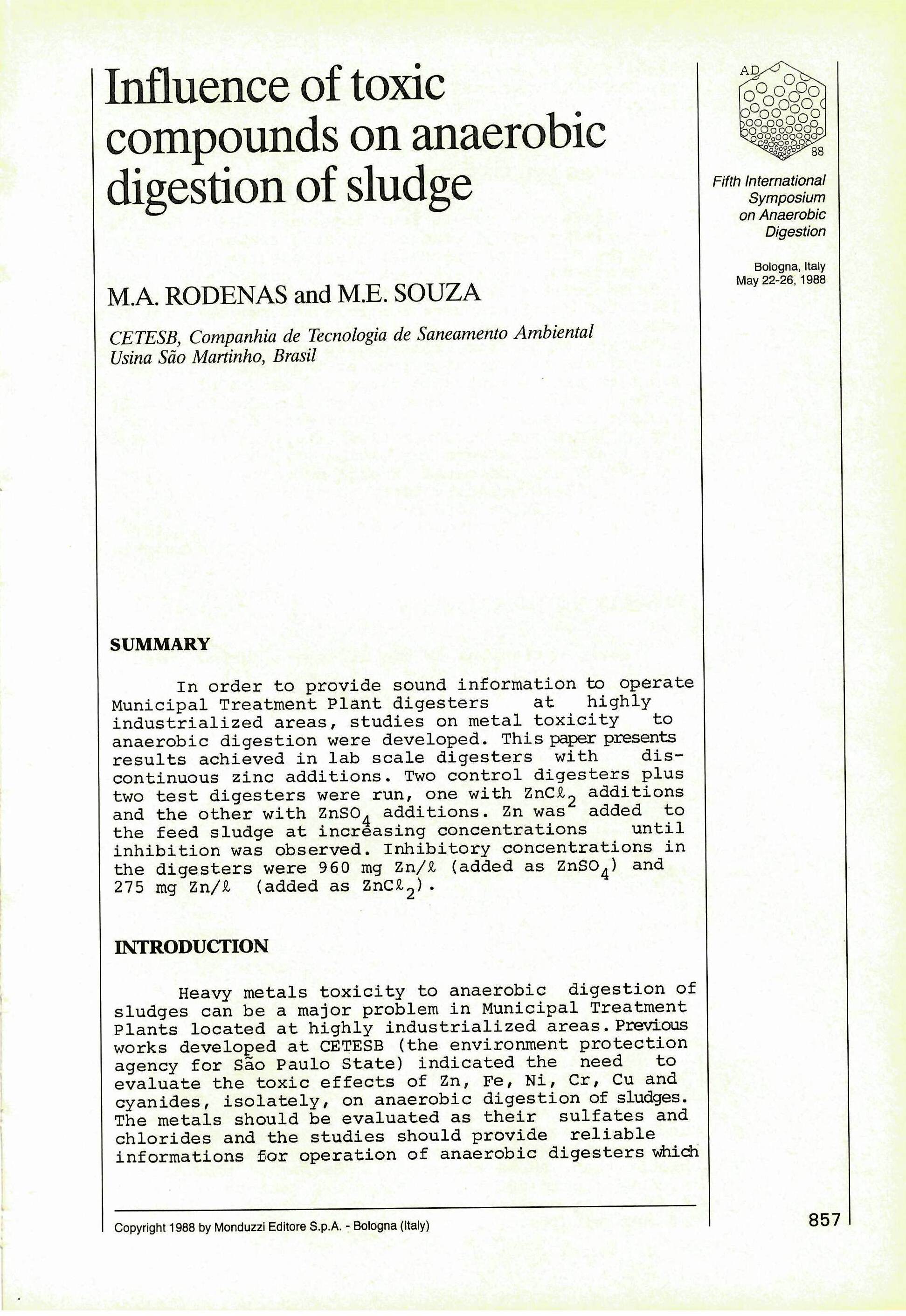 Digestão anaeróbia , Compostos químicos , Esgotos , Arquivo técnico , Memória institucional , CETESB