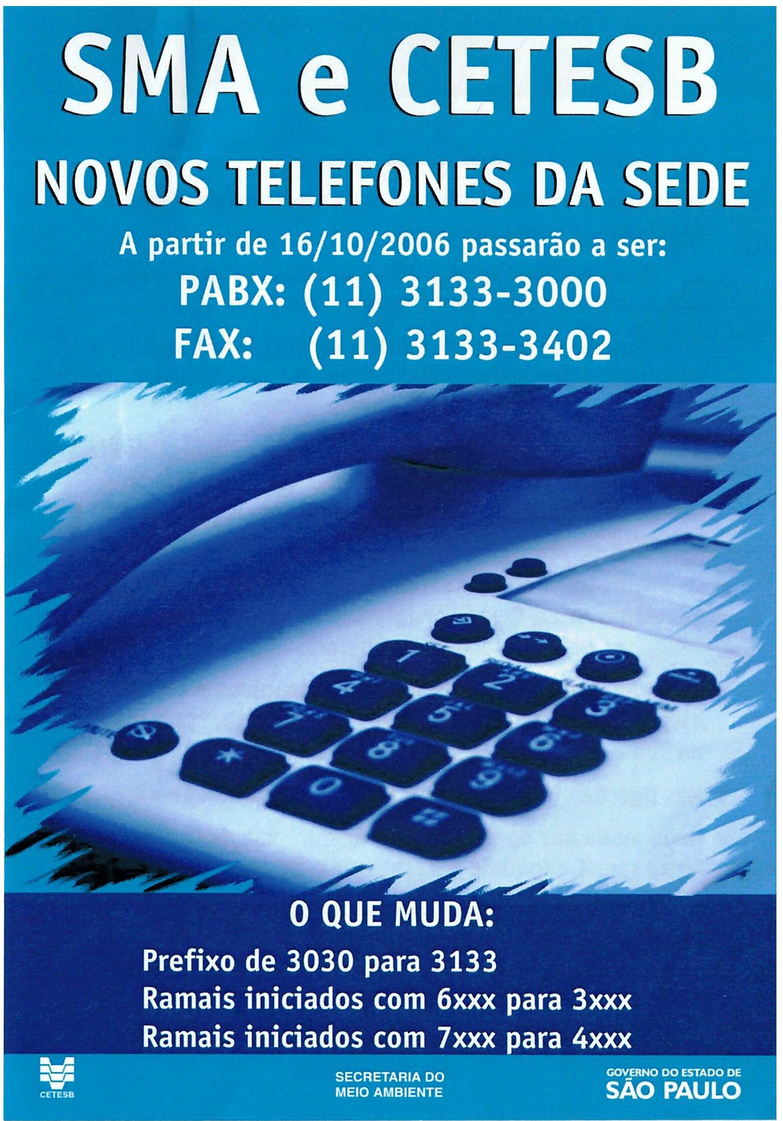 Transcrição: [Anverso] SMA e CETESB Novos telefones na sede a partir de 16/10/2006 passarão a ser: [...] [imagem de teclado de telefone fixo] O que muda: [...] [Verso] Importante Avise todos os seus contatos. Inclua os novos telefones na sua assinatura de [...]
