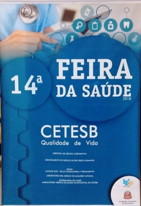 Transcrição [anverso]: [Fundo: imagem] 14ª Feira da Saúde 2018 CETESB Qualidade de Vida Diretoria de Gestão Corporativa Departamento de Gestão de Recursos Humanos Apoio: Luciane Ruis - Reluz Consultoria e Treinamento Laboratório Bio-médico de Análises Clínicas Enfermagem do AMSO - Ambulatório Médico de Saúde Ocupacional da CETESB [Logo] 50 CETESB [Brasão] Governo do Estado de São Paulo