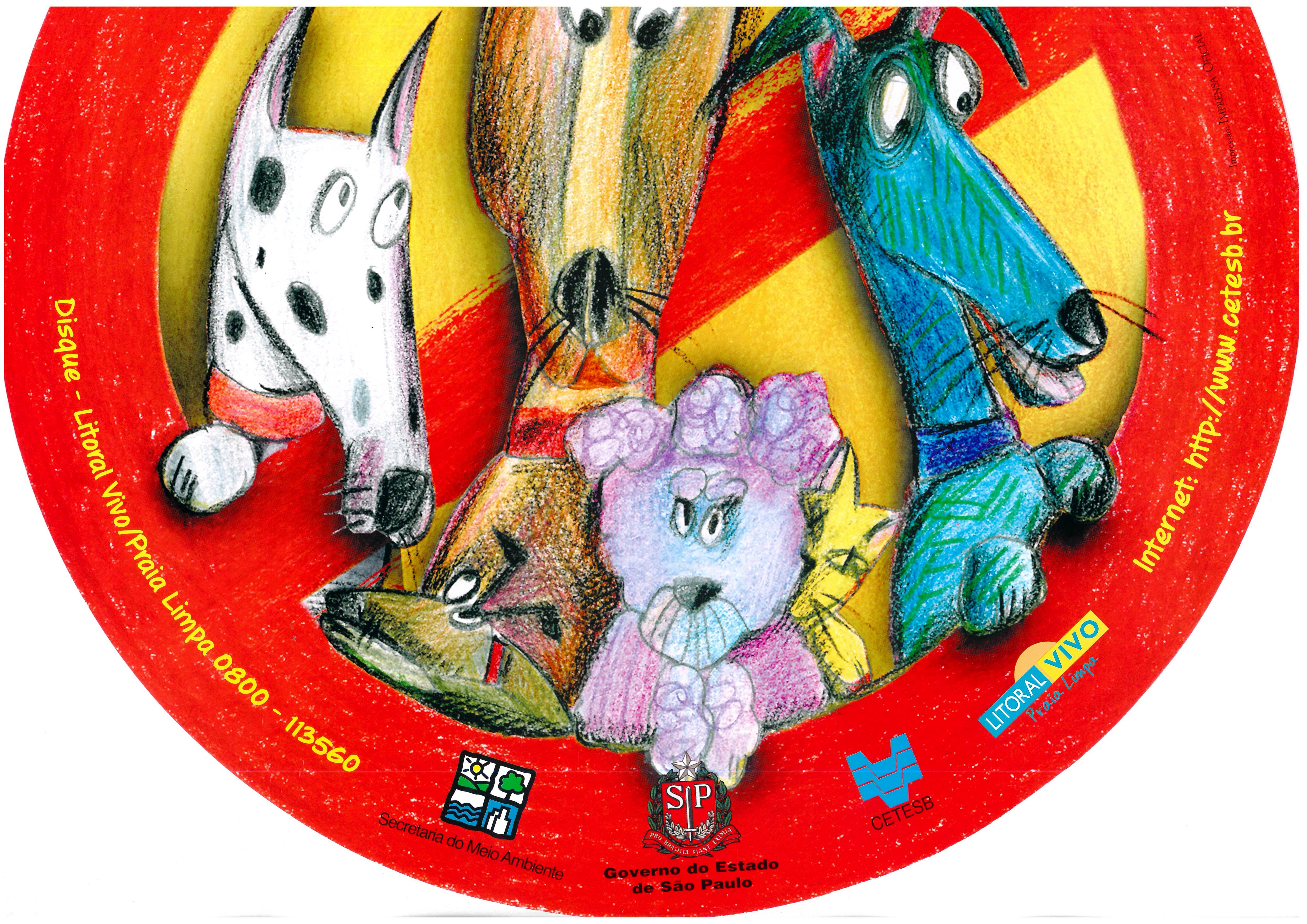Panfleto 1: Anverso: borda fundo vermelho, inscrições cor branca, circular il. color., figura central: cães sobre o símbolo de proibido. Transcrição: Cachorros, na praia não! deixe seus animais de estimação em casa [logo] Litoral Vivo Praia Limpa Verso: texto parte superior. Parte inferior: [brasão SP] Governo do Estado de São Paulo [logo] Secretaria do Meio Ambiente [logo] CETESB [logo] Litoral vivo Praia Limpa Panfleto 2: Anverso: borda fundo vermelho, inscrições cor branca, circular il. color., figura central: cães sobre o símbolo de proibido. Transcrição: Cachorros, na praia não! deixe seus animais de estimação em casa Disque - Litoral Vivo/Praia Limpa 0800-113560 [logo] Secretaria do Meio Ambiente [brasão SP] Governo do Estado de São Paulo [Logo] CETESB [logo] Litoral Vivo Praia Limpa Internet: http://www.cetesb.br Verso: [branco]