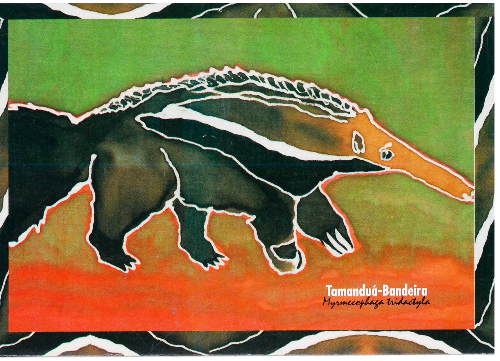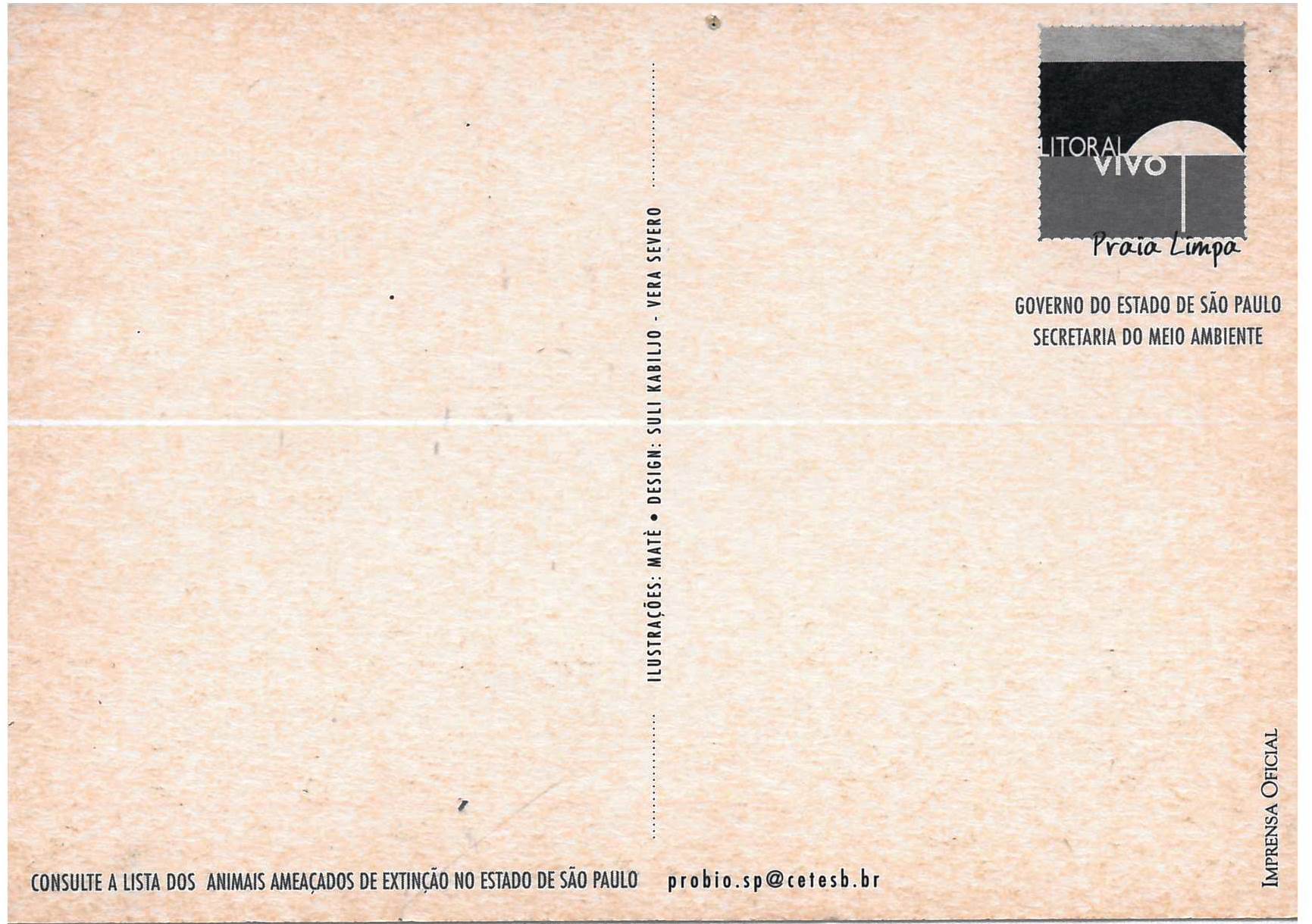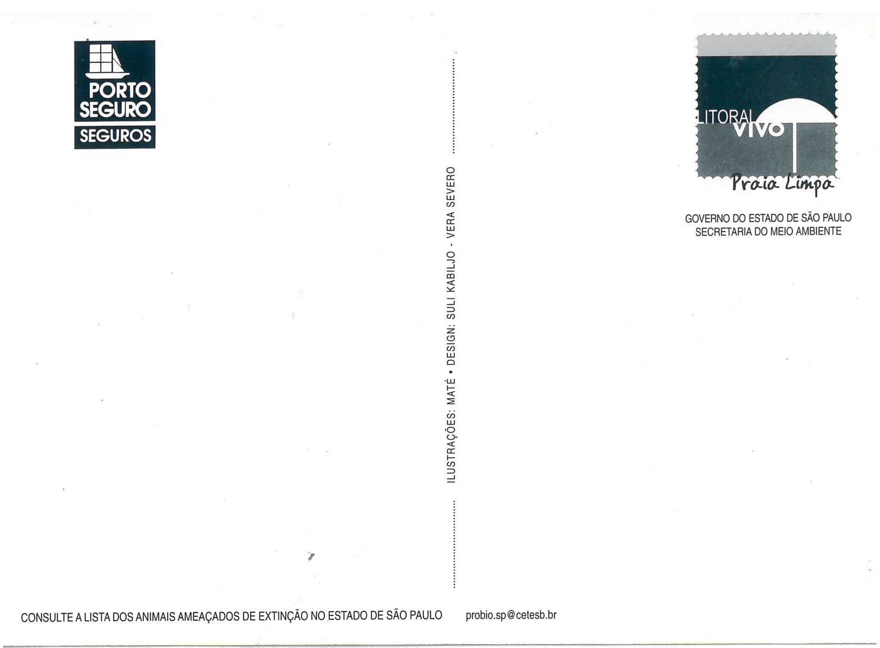Anverso n.1-2: imagem com borda desenhada, cor preto e branco, retângulo il. color., figura central: Tamanduá-bandeira Transcrição: Tamanduá-Bandeira Myrmecophaga tridactyla Verso n. 1: Transcrição: [Parte central vertical] Ilustrações - Maté . Design - Sul Kabiljo. Vera Severo. Transcrição [Parte superior direita] [Logo] Litoral Vivo Praia limpa. Governo do Estado de São Paulo, Secretaria do Meio Ambiente. Transcrição [Parte inferior] Consulte a lista dos animais ameaçados de extinção no Estado de São Paulo. probio.sp@cetesb.br Verso n. 2: Transcrição: [Parte superior esquerda] [Logo] Porto Seguro Seguros. [Parte central vertical] Ilustrações - Maté . Design - Sul Kabiljo. Vera Severo. Transcrição [Parte superior direita] [Logo] Litoral Vivo Praia limpa. Governo do Estado de São Paulo, Secretaria do Meio Ambiente. Transcrição [Parte inferior] Consulte a lista dos animais ameaçados de extinção no Estado de São Paulo. probio.sp@cetesb.br Imprensa Oficial