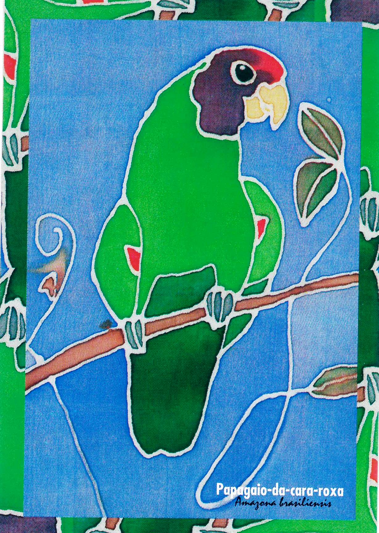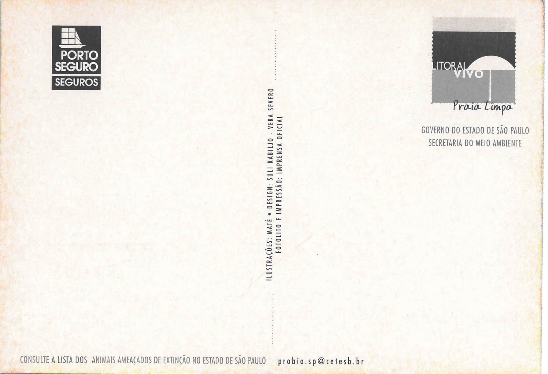 Anverso: imagem com borda desenhada, cor verde predominante, retângulo il. em tons azuis com a figura de um papagaio pousado em um tronco marrom. Transcrição: Papagaio-da-cara-roxa Amazona brasilienses. Verso: parte superior esquerda. Transcrição: [Logo] Porto Seguro Seguros. Parte central vertical. Transcrição: Ilustrações - Maté . Design - Sul Kabiljo. Vera Severo. Fotolito e impressão: Imprensa Oficial. Parte superior direita. Transcrição: [Logo] Litoral Vivo Praia limpa. Governo do Estado de São Paulo, Secretaria do Meio Ambiente. Parte inferior. Transcrição: Consulte a lista dos animais ameaçados de extinção no Estado de São Paulo. probio.sp@cetesb.br Imprensa Oficial