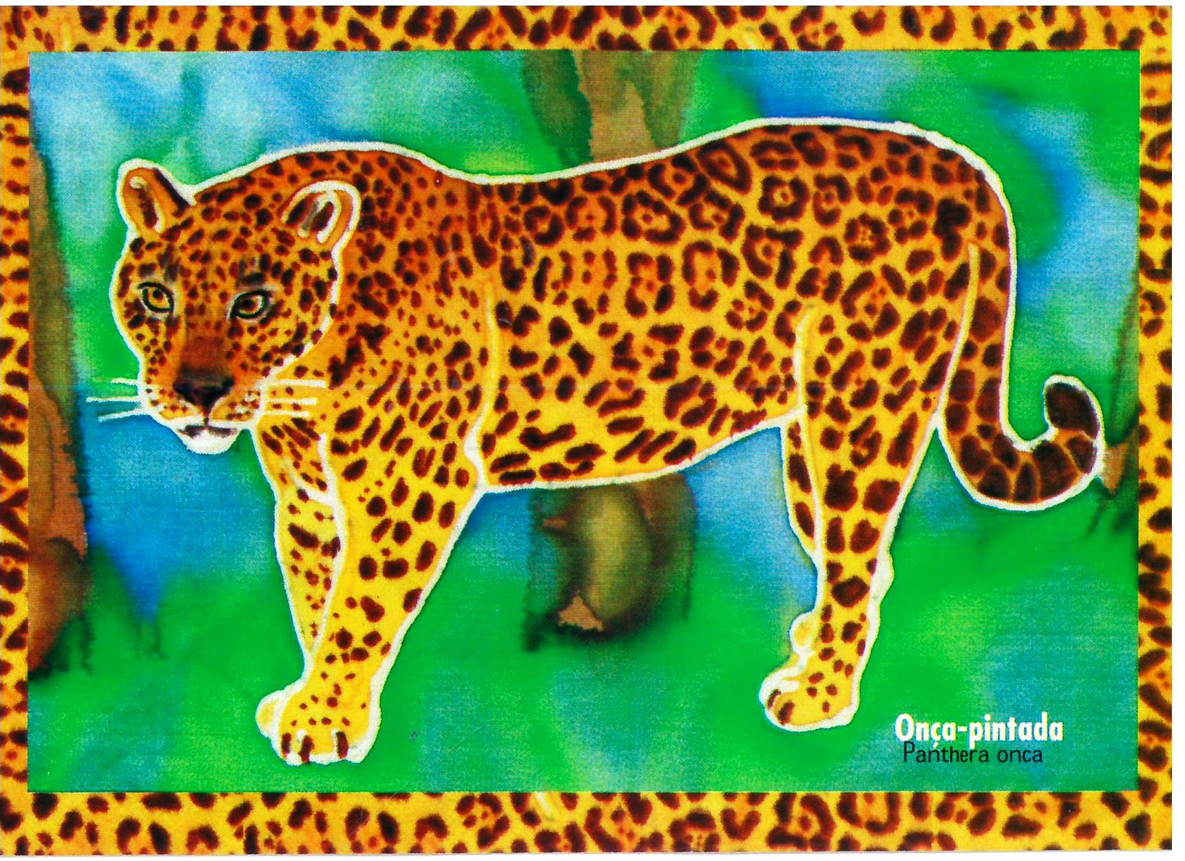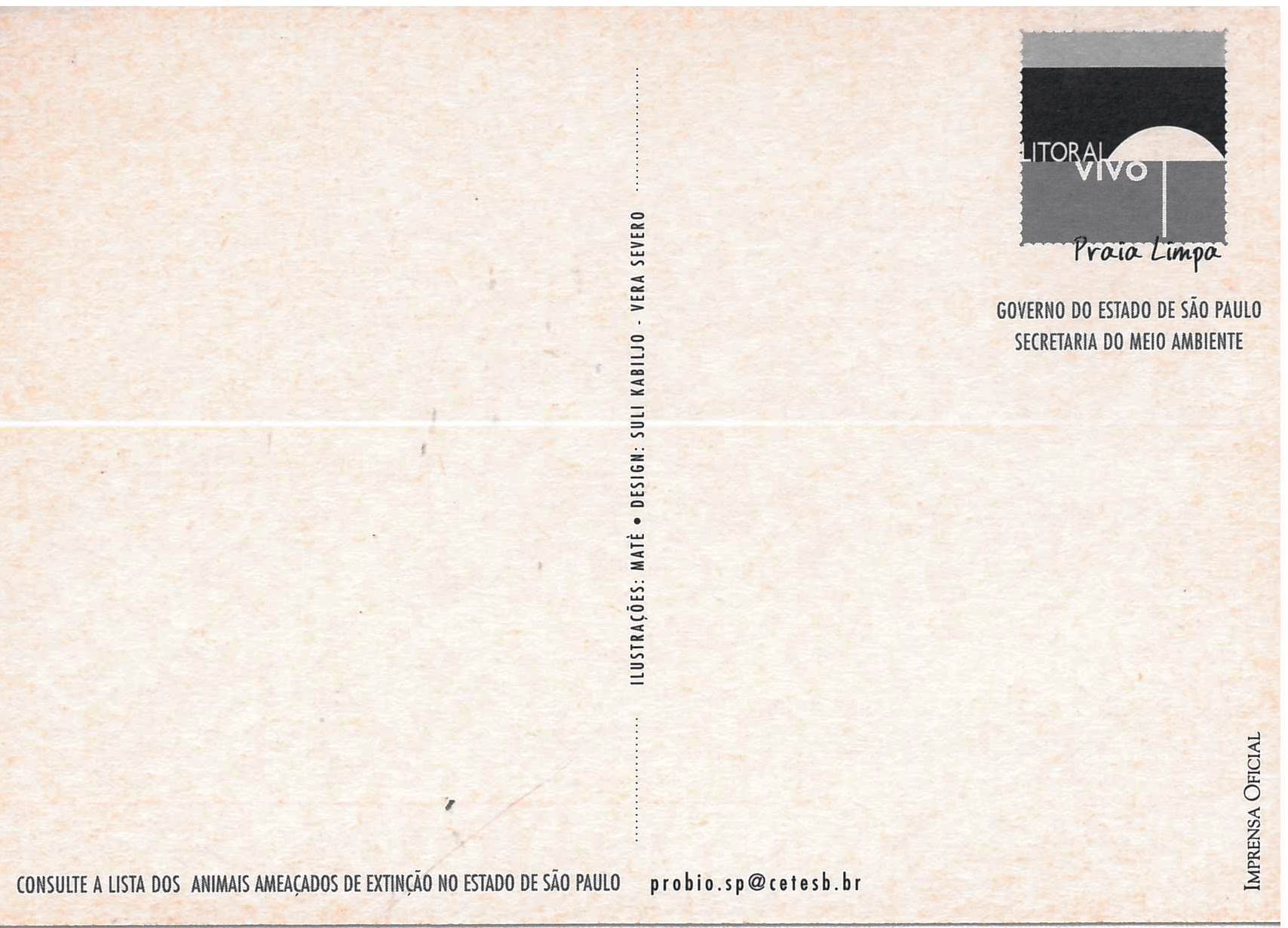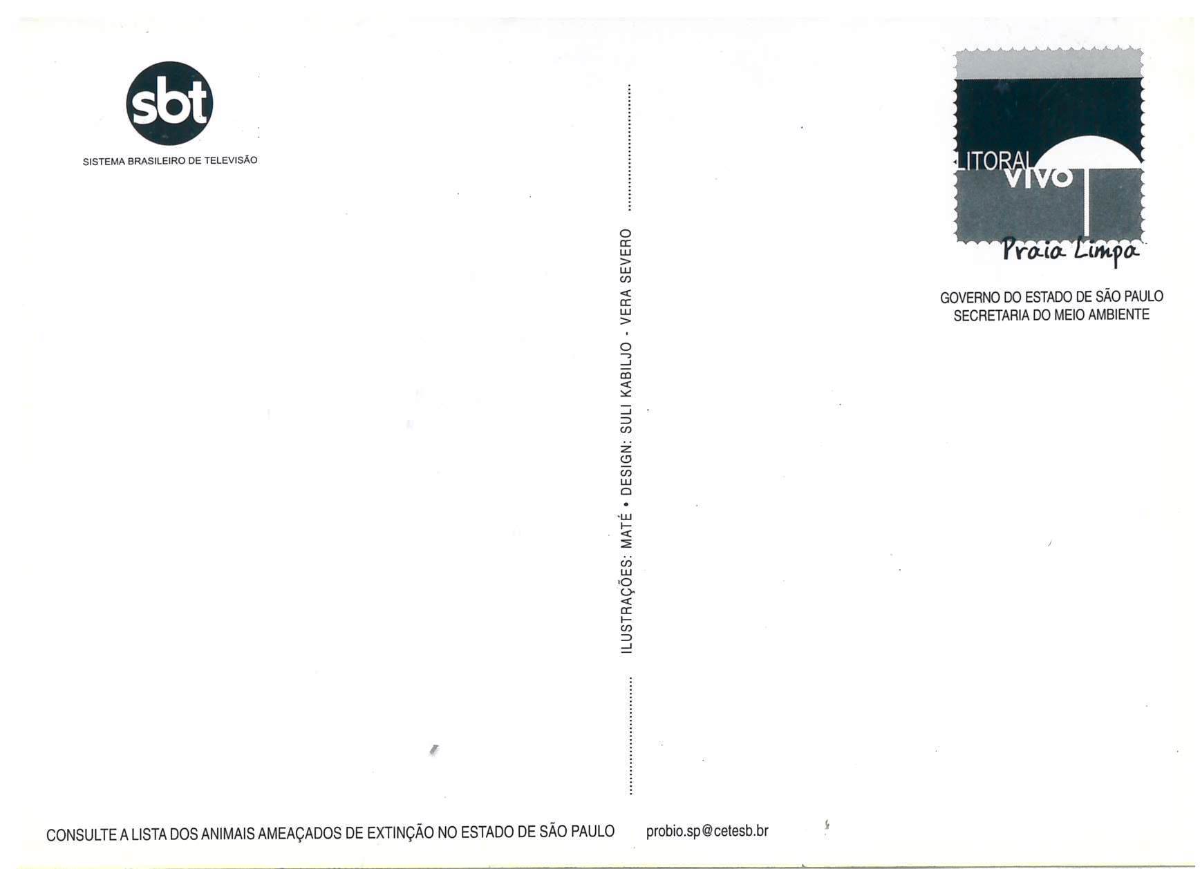 Anverso n.1-2: imagem com borda desenhada, cor preto e branco, retângulo il. color., figura central: Onça-pintada Transcrição: Onça-pintada Panthera onca Verso n. 1: Transcrição: [Parte central vertical] Ilustrações - Maté . Design - Sul Kabiljo. Vera Severo. Transcrição [Parte superior direita] [Logo] Litoral Vivo Praia limpa. Governo do Estado de São Paulo, Secretaria do Meio Ambiente. Transcrição [Parte inferior] Consulte a lista dos animais ameaçados de extinção no Estado de São Paulo. probio.sp@cetesb.br Verso n. 2: Transcrição: [Parte superior esquerda] [Logo] SBT Sistema Brasileiro de Televisão [Parte central vertical] Ilustrações - Maté . Design - Sul Kabiljo. Vera Severo. Transcrição [Parte superior direita] [Logo] Litoral Vivo Praia limpa. Governo do Estado de São Paulo, Secretaria do Meio Ambiente. Transcrição [Parte inferior] Consulte a lista dos animais ameaçados de extinção no Estado de São Paulo. probio.sp@cetesb.br Imprensa Oficial