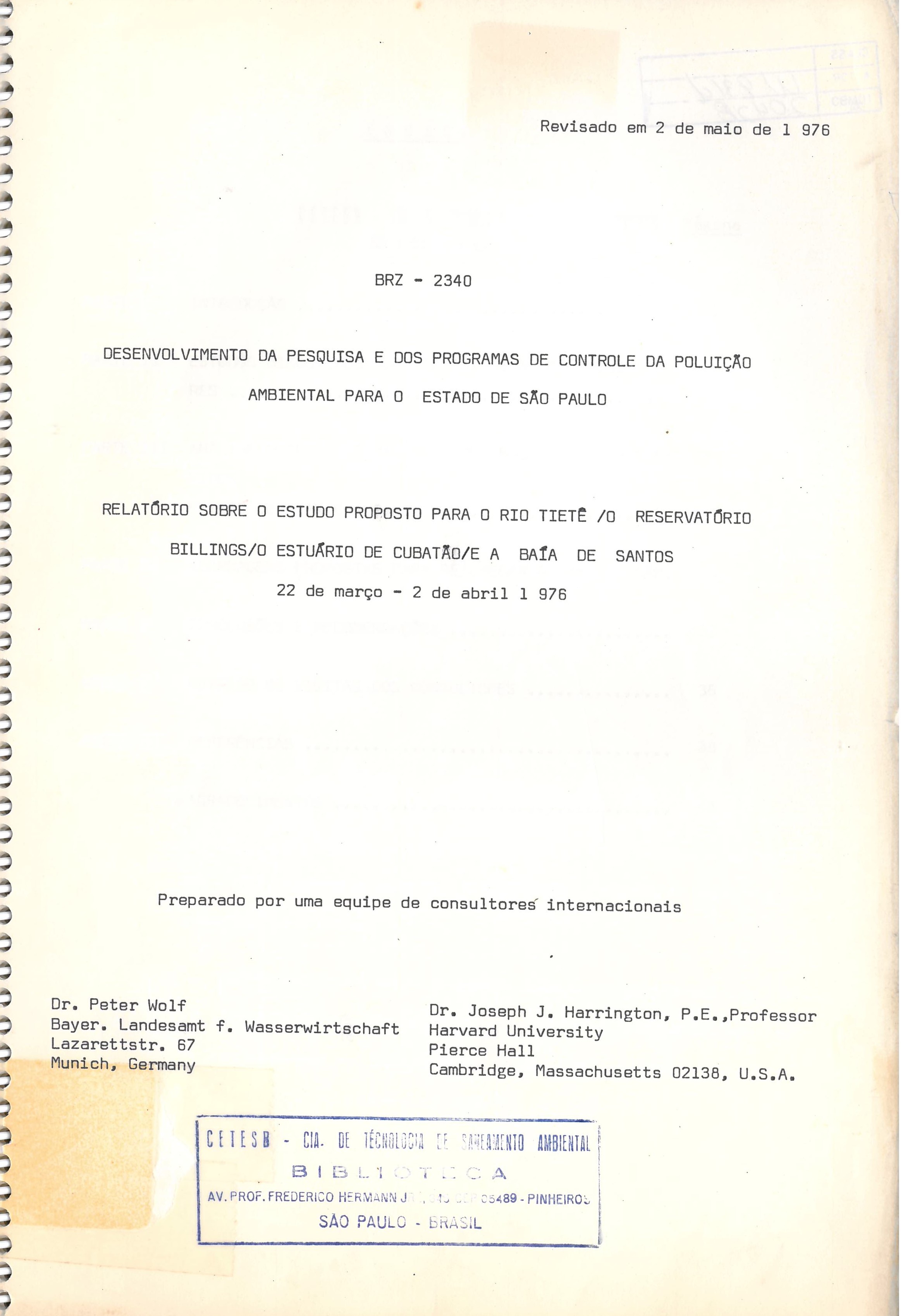 Relatório sobre o estudo proposto para o Rio Tietê: Reservatório Billings, o Estuário de Cubatão e a Bacia de Santos - 22 de março a 02 de abril 1976