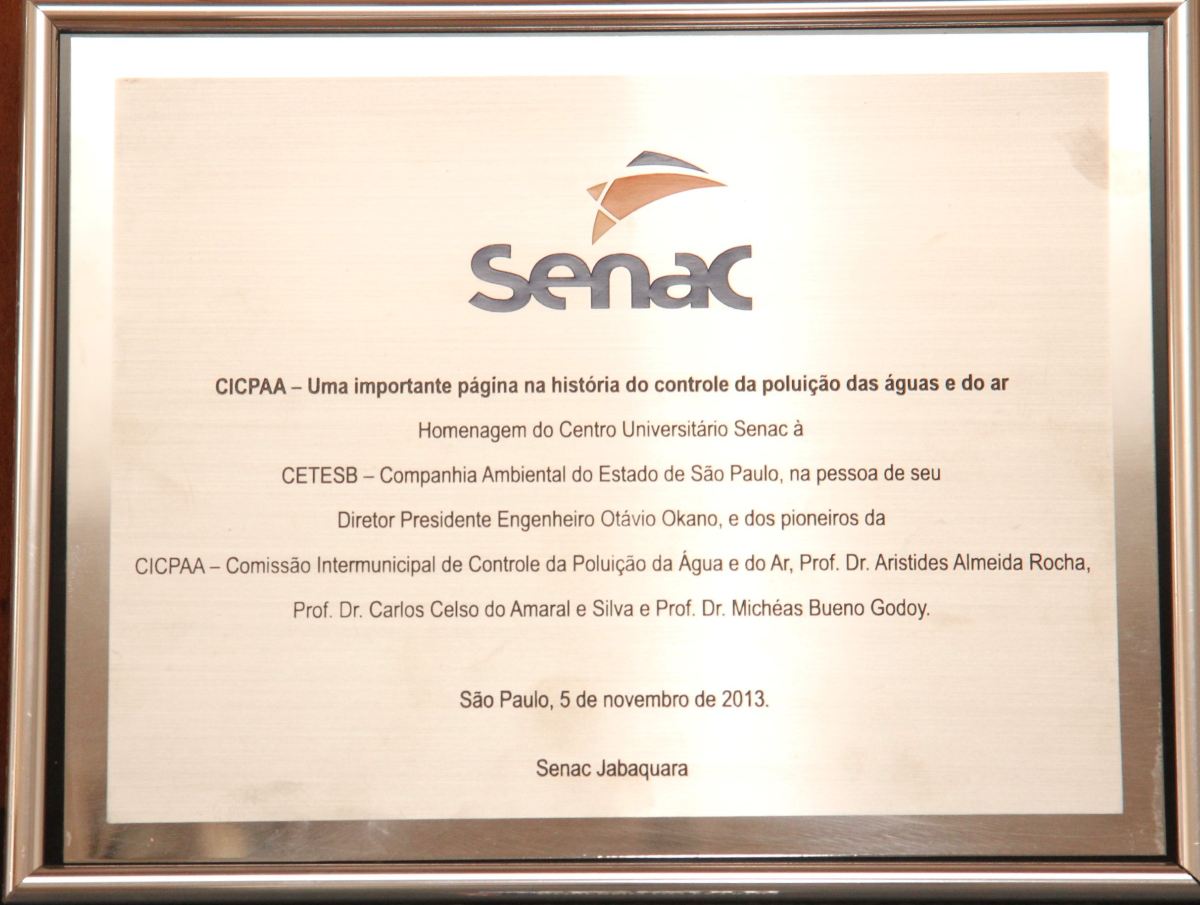 Transcrição: [Logo] SENAC CICPAA - Uma importante página na história do controle da poluição das água e do ar Homenagem do Centro Universitário Senac à CETESB - Companhia Ambiental do Estado de São Paulo, na pessoa de seu Diretor Presidente Engenheiro Otávio Okano, e dos pioneiros da CICPAA - Comissão Intermunicipal de Controle da Poluição da Água e do Ar, Prof. Dr. Aristides Almeida Rocha, Prof. Dr. Carlos Celso do Amaral e Silva e Prof. Dr. Michéas Bueno Godoy. São Paulo, 5 de novembro de 2013. Senac Jabaquara
