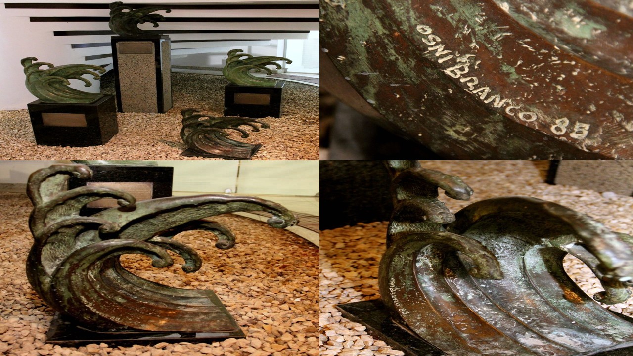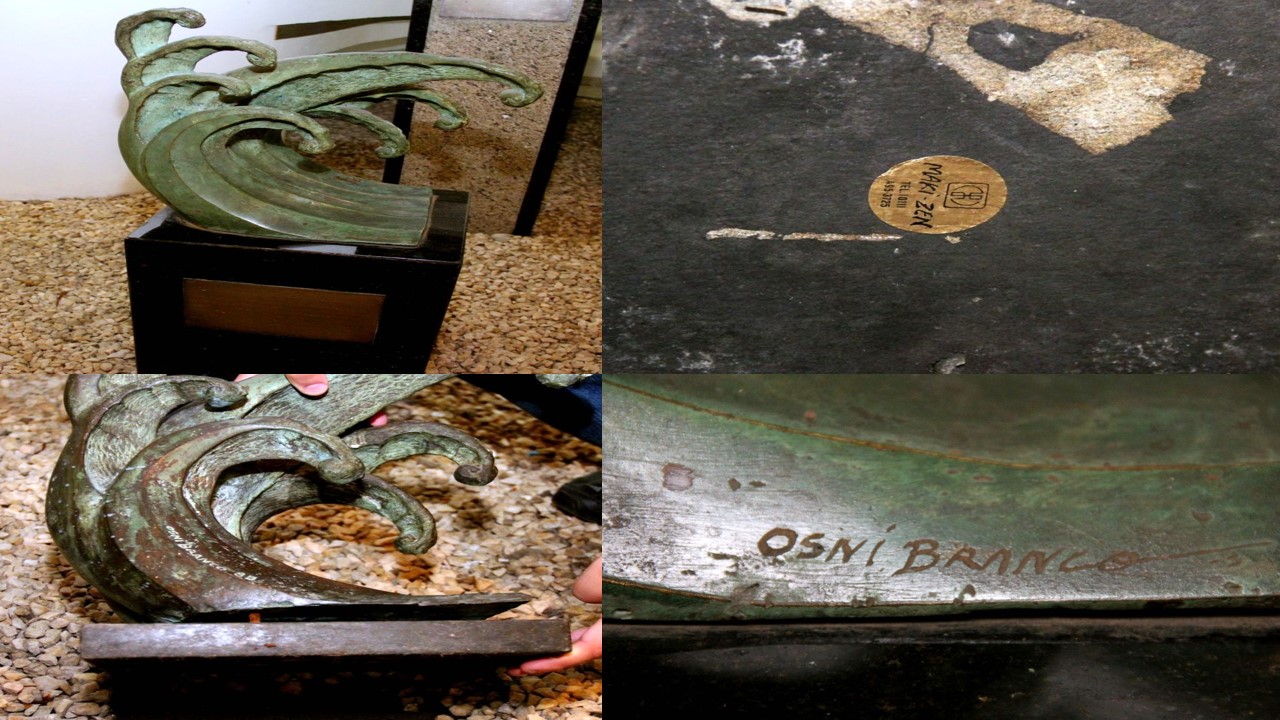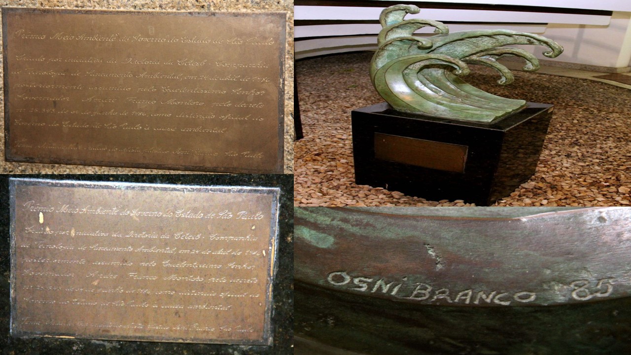 Transcrição (peças): OSNI BRANCO 85 Transcrição (placas): Prêmio "Meio Ambiente” do Governo do Estado de São Paulo Criado por iniciativa da Diretoria da Cetesb – Companhia De Tecnologia de Saneamento Ambiental, em 24 de junho de 1986 posteriormente assumido pelo Excelentíssimo Senhor Governador André Franco Montoro, pelo decreto nº 25.343 de 4 de junho de 1986, como distinção oficial do Governo do Estado de São Paulo à causa ambiental. Tema: Onda de Mar, criação do artista plástico Osni Branco, São Paulo