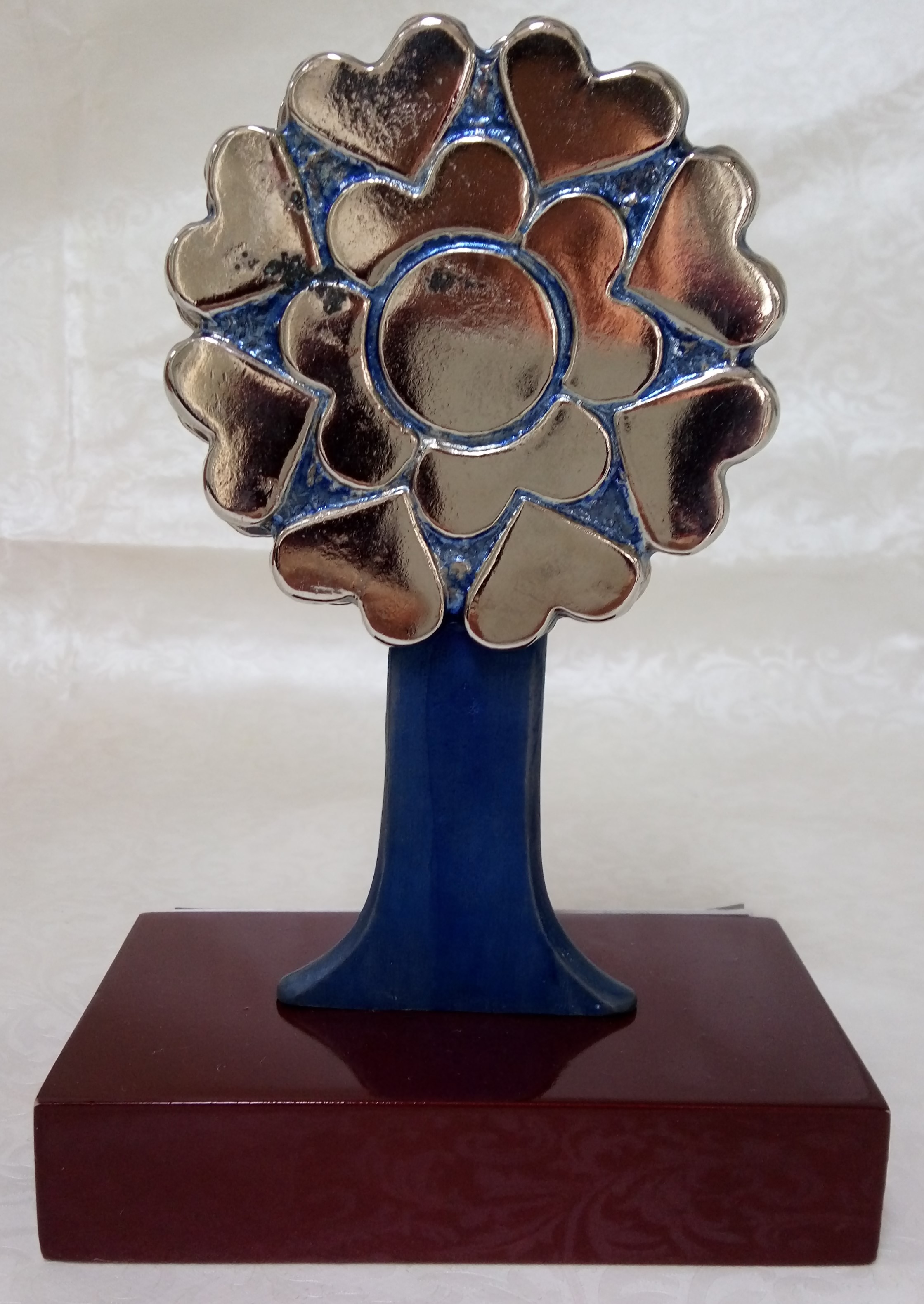 Transcrição: [Logo: Árvore em metal prateado, formada por 8 corações externos e flor central, colada a um tronco - anverso=verso] [Suporte da árvore similar a um tronco, pintado em azul - anverso=verso] [Base em madeira, pintura brilhante avermelhada na parte superior e laterais, frontal com etiqueta adesiva em fundo cinza, com inscrições, sob placa retangular branca em plástico rígido]: Prêmio Interlocutor Mais Antigo Pedreira [Base - parte inferior: etiqueta adesiva em papel branco, colada sob retângulo plastificado cor preta, brilhante]: ARONI Ind. Com. De Troféus E Medalhas Fonte: 11-4749-8215/11-96745624 www.aronitrofeus.com.br