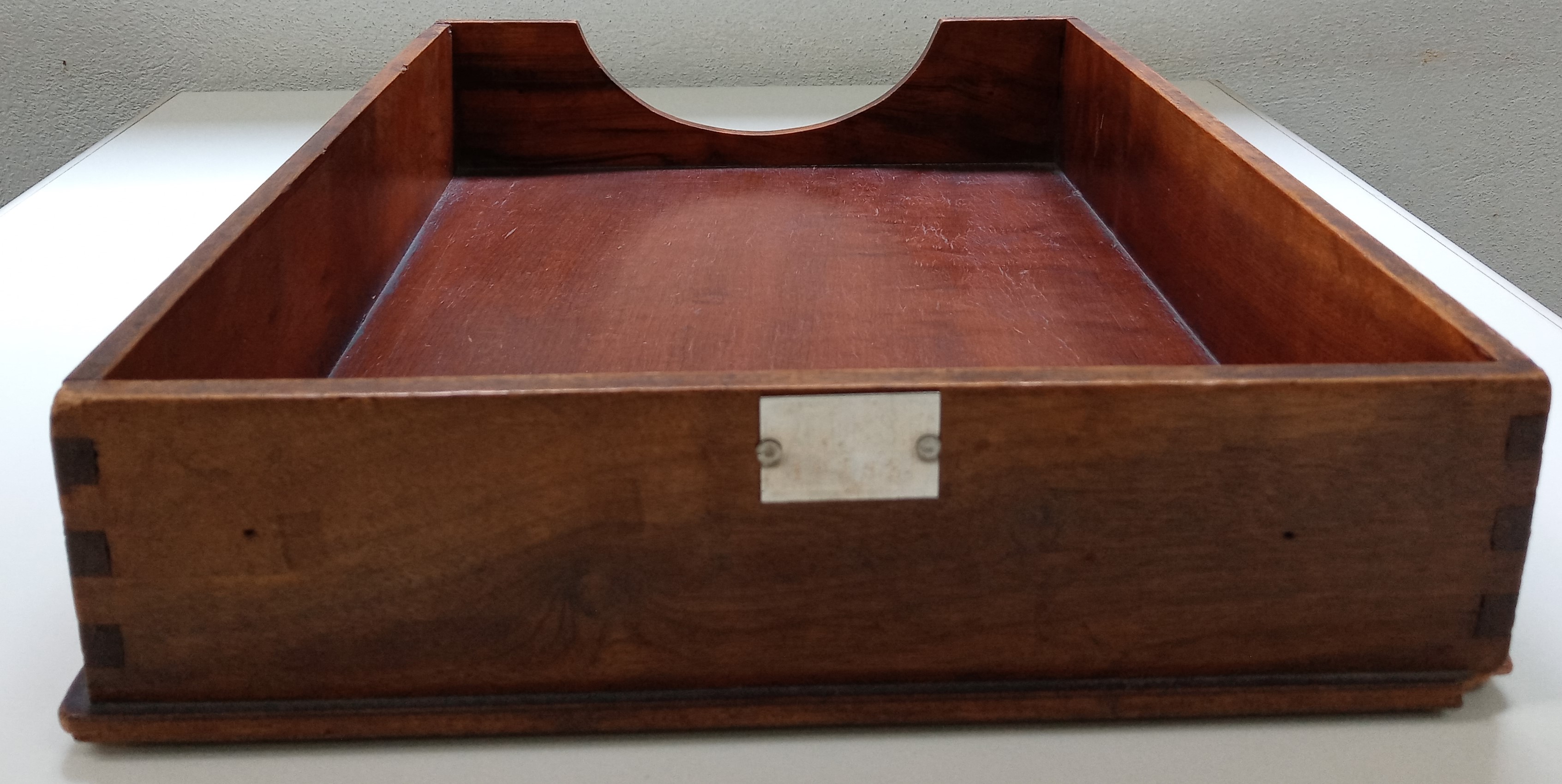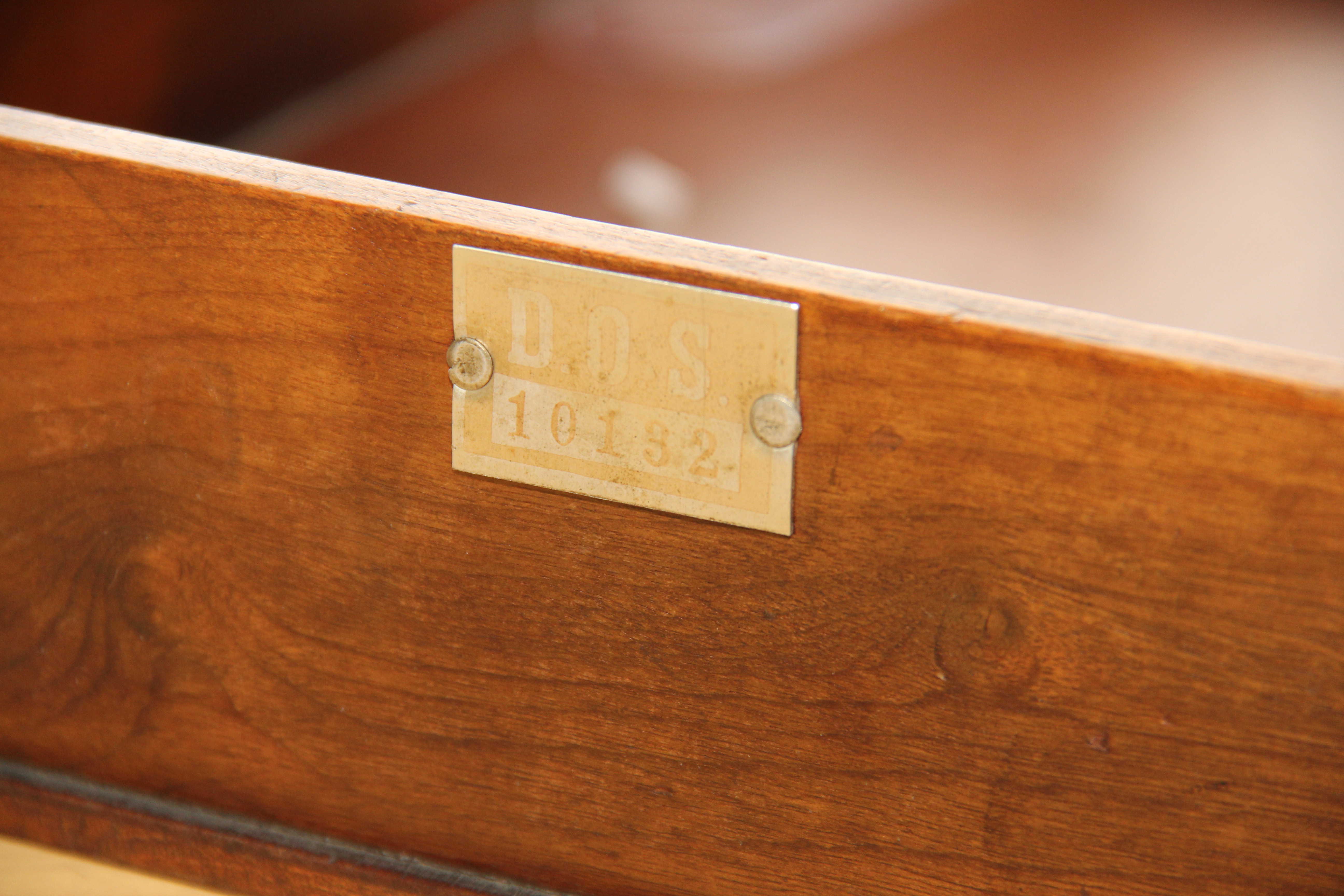 Transcrição da etiqueta em papel branco (amarelado) colada na face inferior: [Lado esquerdo] Fábrica de Móveis Tarricone Filhos Ltda. Fábrica e escritório: Rua Thiers, 37 a 47 - Fone: 9-4346 São Paulo Indústria Brasileira [Lado direito] Até CR$50,00 selado com CR$ 20,00" [Abaixo: 2 selos retangulares cor verde com inscrição: Brasil 1,00]