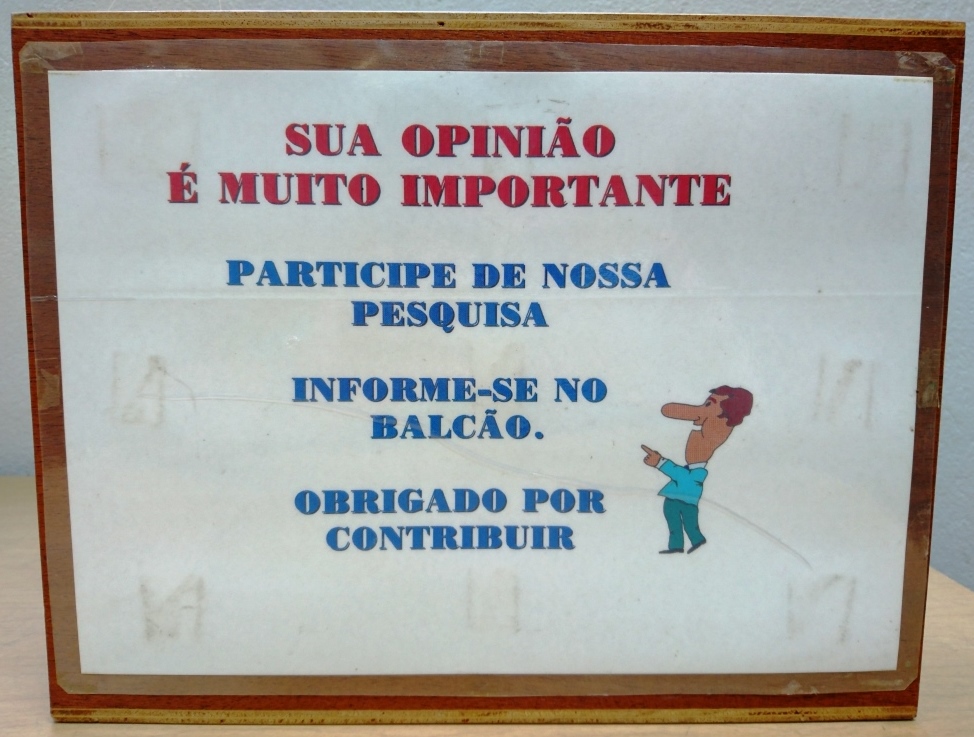 Transcrição: Sua opinião é muito importante Participe de nossa pesquisa Informe-se no balcão. Obrigado por contribuir Fig. masculina