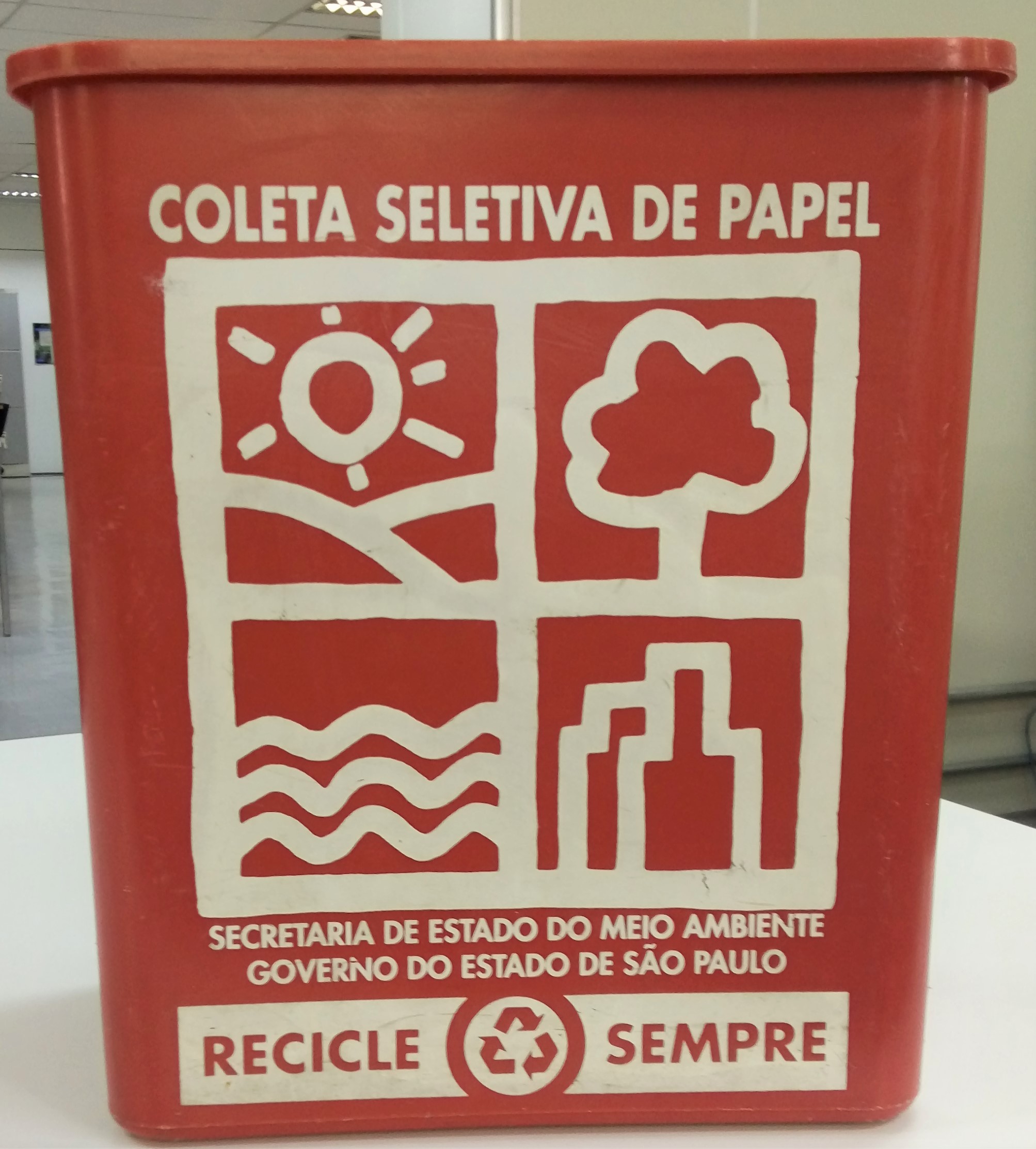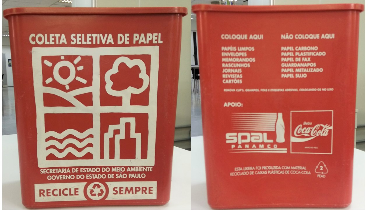 INSCRIÇÕES em letras na cor branca ANVERSO: Coleta seletiva de papel [Logo SMA] Secretaria de Estado do Meio Ambiente, Governo do Estado de São Paulo Recicle [Símbolo da reciclagem] Sempre VERSO: [coluna à esquerda] Coloque aqui (branco): papéis limpos, envelopes, memorandos, rascunhos, jornais, revistas, cartões [coluna à esquerda] Não coloque aqui: papel carbono, papel plastificado, papel de fax, guardanapos, papel metalizado, papel sujo Remova clip's, grampos, fitas e etiquetas adesivas, colocando-os no lixo Apoio: Spal Panamco [Logo] Beba Coca-Cola Esta lixeira foi produzida com material reciclado de caixas plásticas de Coca-cola Base INFERIOR: [relevo] KAPLAS [dentro de moldura retangular] Indústria brasileira 640921