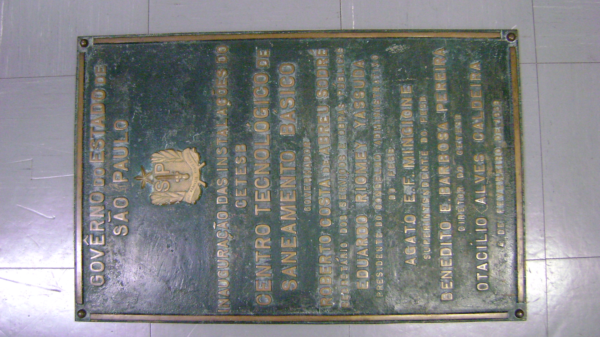 O Centro Tecnológico de Saneamento Básico (CETESB) foi criado através do Decreto estadual nº 50.079 de 24 de julho de 1968, subordinado ao Conselho Administrativo do Fomento Estadual de Saneamento Básico (FESB), instituído através da Lei 10.107 de 8 de maio de 1968, vinculado à Secretaria dos Serviços e Obras Públicas. O CETESB recebeu por transferência 4 laboratórios unificados do Serviço de Laboratório e Operação do Departamento de Obras Sanitárias. Com isso, em 4 de fevereiro de 1969 o CETESB foi inaugurado no bairro de Pinheiros - SP, sediado no prédio originariamente destinado a laboratórios do Departamento de Águas e Esgotos, junto à Estação de Tratamento de Esgotos de Pinheiros com uma área anexa, e este evento comemorativo originou a referida placa.