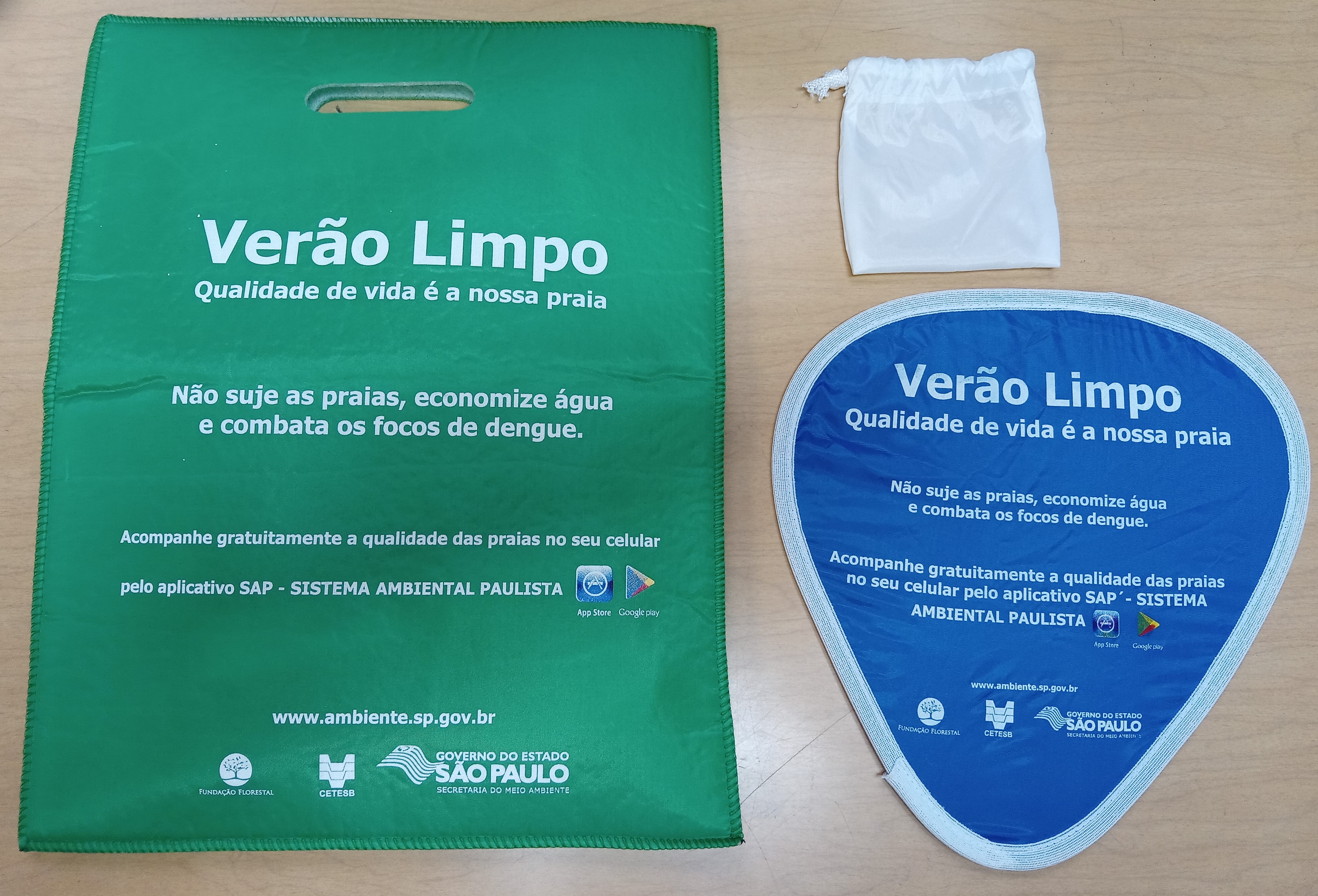 Transcrição SACOLA: [Anverso] Verão Limpo / Qualidade de vida é a nossa praia / Não suje as praias, economize água e combate os focos de dengue. / Acompanhe gratuitamente a qualidade das praias no seu celular pelo aplicativo SAP - SISTEMA AMBIENTAL PAULISTA / [ logos] App Store, Google Play / www.ambiente.sp.gov.br / [logos] Fundação Florestal, CETESB, Governo do Estado de São Paulo Secretaria do Meio Ambiente [Verso] Praia Limpa / - Recolha o lixo na sua sacola. - Esvazie-a na lixeira ou leva para descartar em casa. - Sempre que for à praia, leve sua sacola. - Colabora com a coleta seletiva; separe o lixo reciclável. / Aproveite o verão: 1. Veifique sempre as condições das praias: bandeira verde - própria para o banho. bandeira vermelha - imprópria para banho. 2. Evite o sol entre as 10 e às 16horas. 3. Use sempre chapéu e protetor solar. 4. Evite banhos de mar logo após se alimentar ou ingerir bebida alcoólica. 5. Atenção as advertências dos salva-vidas. Evite afogamentos. 6. Beba muito líquido para hidratar o corpo. 7. Evite o contato com o mar próximo a canais e rios. 8. Evite banhos de mar após chuvas intensas. 10. Não perca as crianças de vista. Fique sempre atento. www.ambiente.sp.gov.br Transcrição LEQUE: [Anverso] Verão Limpo / Qualidade de vida é a nossa praia / Não suje as praias, economize água e combate os focos de dengue. / Acompanhe gratuitamente a qualidade das praias no seu celular pelo aplicativo SAP - SISTEMA AMBIENTAL PAULISTA / [ logos] App Store, Google Play / www.ambiente.sp.gov.br / [logos] Fundação Florestal, CETESB, Governo do Estado de São Paulo Secretaria do Meio Ambiente