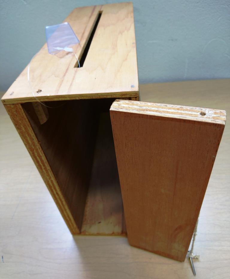 Confeccionada pela marcenaria da CETESB, foi utilizada para uma pesquisa de qualidade do atendimento dos funcionários, do espaço e do acervo da biblioteca da CETESB no fim dos anos 1980. Todos usuários (internos e externos) foram convidados a participar e deixar suas sugestões dentro da caixa que ficou sob o balcão de atendimento durante longo período até apuração dos resultados. Posteriormente deixou de ser utilizada, pois a avaliação da área era realizada de outra forma. Com o advento das novas tecnologias da informação e comunicação, no fim dos anos 1990, os emails foram utilizados para receber as críticas, sugestões e reclamações dos usuários da Biblioteca.