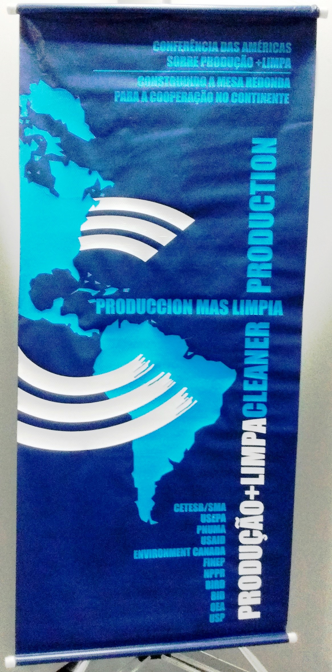 Transcrição: Anverso: Conferência das Américas sobre Produção + Lima construindo a mesa redonda para a cooperação no continente Produccion mais limpia Produção + limpa Cleaner production CETESB/SMA USEPA PNUMA USAID ENVIRONMENT CANADA FINEP NPPR BIRD OEA USP Verso: sem inscrições