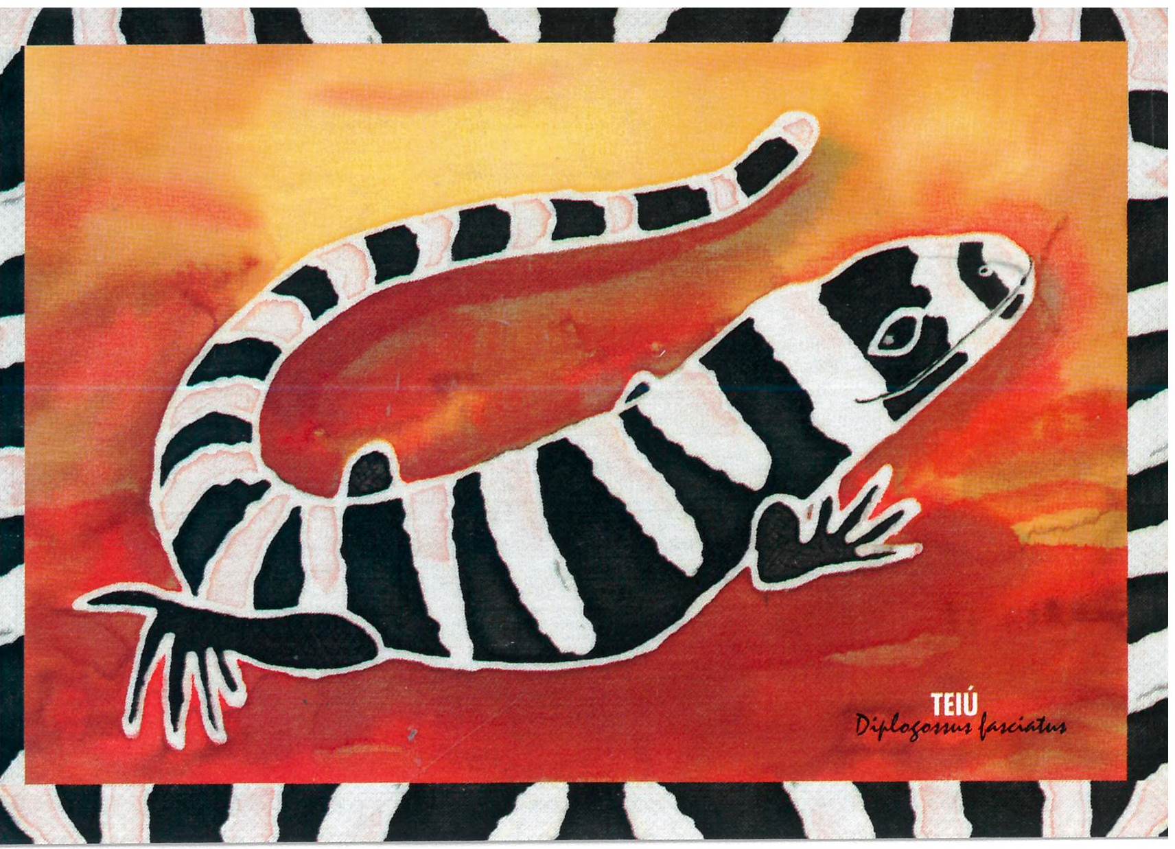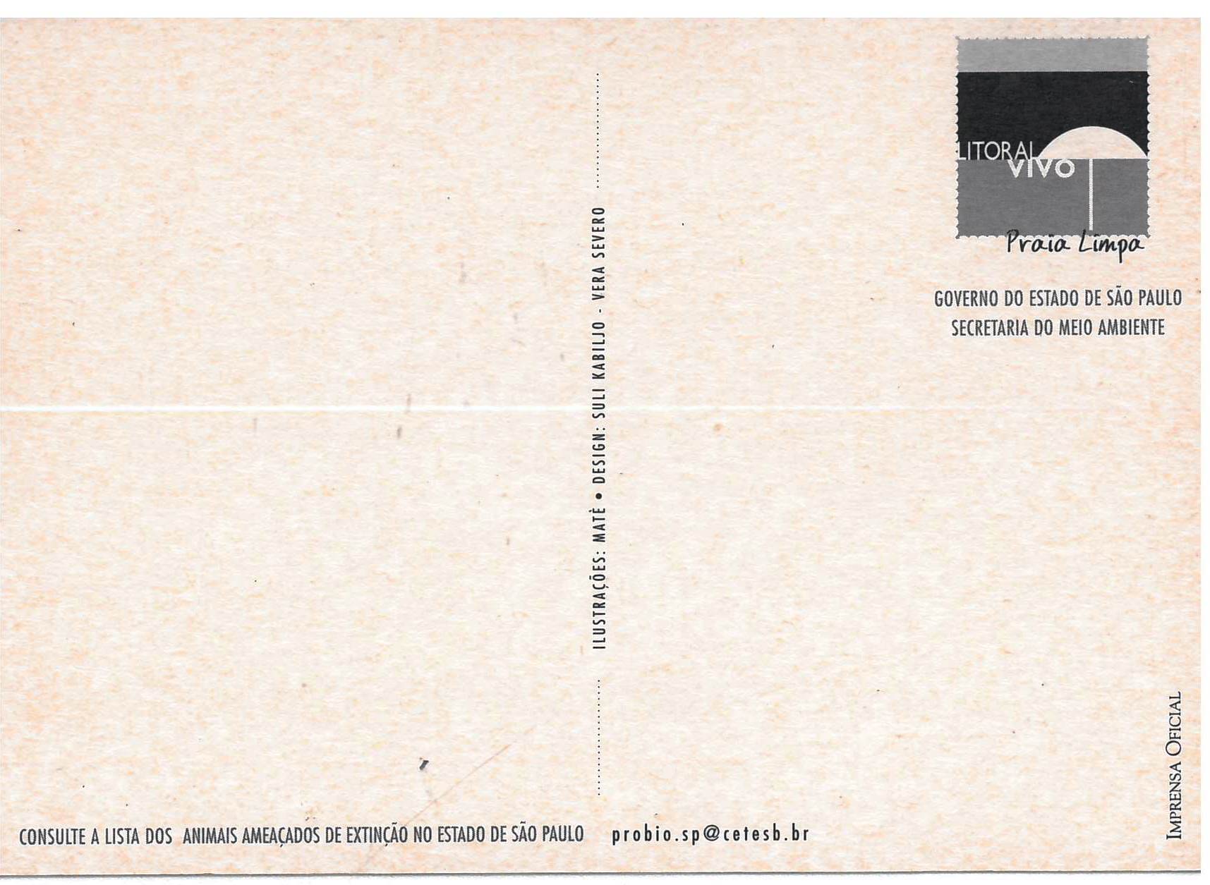 Anverso n.1-2: imagem com borda desenhada, cor preto e branco, retângulo il. color., figura central: Teiú Transcrição: Teiú Diplogossus fasciatus Verso n. 1: Transcrição: [Parte central vertical] Ilustrações - Maté . Design - Sul Kabiljo. Vera Severo. Transcrição [Parte superior direita] [Logo] Litoral Vivo Praia limpa. Governo do Estado de São Paulo, Secretaria do Meio Ambiente. Transcrição [Parte inferior] Consulte a lista dos animais ameaçados de extinção no Estado de São Paulo. probio.sp@cetesb.br Verso n. 2: Transcrição: [Parte superior esquerda] [Logo] o.b. [Parte central vertical] Ilustrações - Maté . Design - Sul Kabiljo. Vera Severo. Transcrição [Parte superior direita] [Logo] Litoral Vivo Praia limpa. Governo do Estado de São Paulo, Secretaria do Meio Ambiente. Transcrição [Parte inferior] Consulte a lista dos animais ameaçados de extinção no Estado de São Paulo. probio.sp@cetesb.br Imprensa Oficial