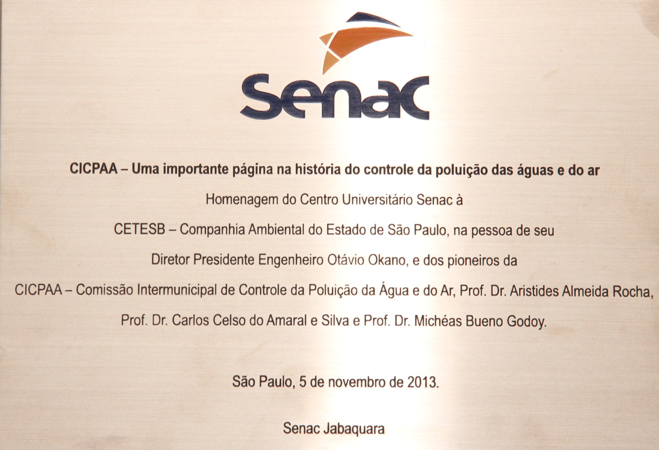 Transcrição: [Logo] SENAC CICPAA - Uma importante página na história do controle da poluição das água e do ar Homenagem do Centro Universitário Senac à CETESB - Companhia Ambiental do Estado de São Paulo, na pessoa de seu Diretor Presidente Engenheiro Otávio Okano, e dos pioneiros da CICPAA - Comissão Intermunicipal de Controle da Poluição da Água e do Ar, Prof. Dr. Aristides Almeida Rocha, Prof. Dr. Carlos Celso do Amaral e Silva e Prof. Dr. Michéas Bueno Godoy. São Paulo, 5 de novembro de 2013. Senac Jabaquara