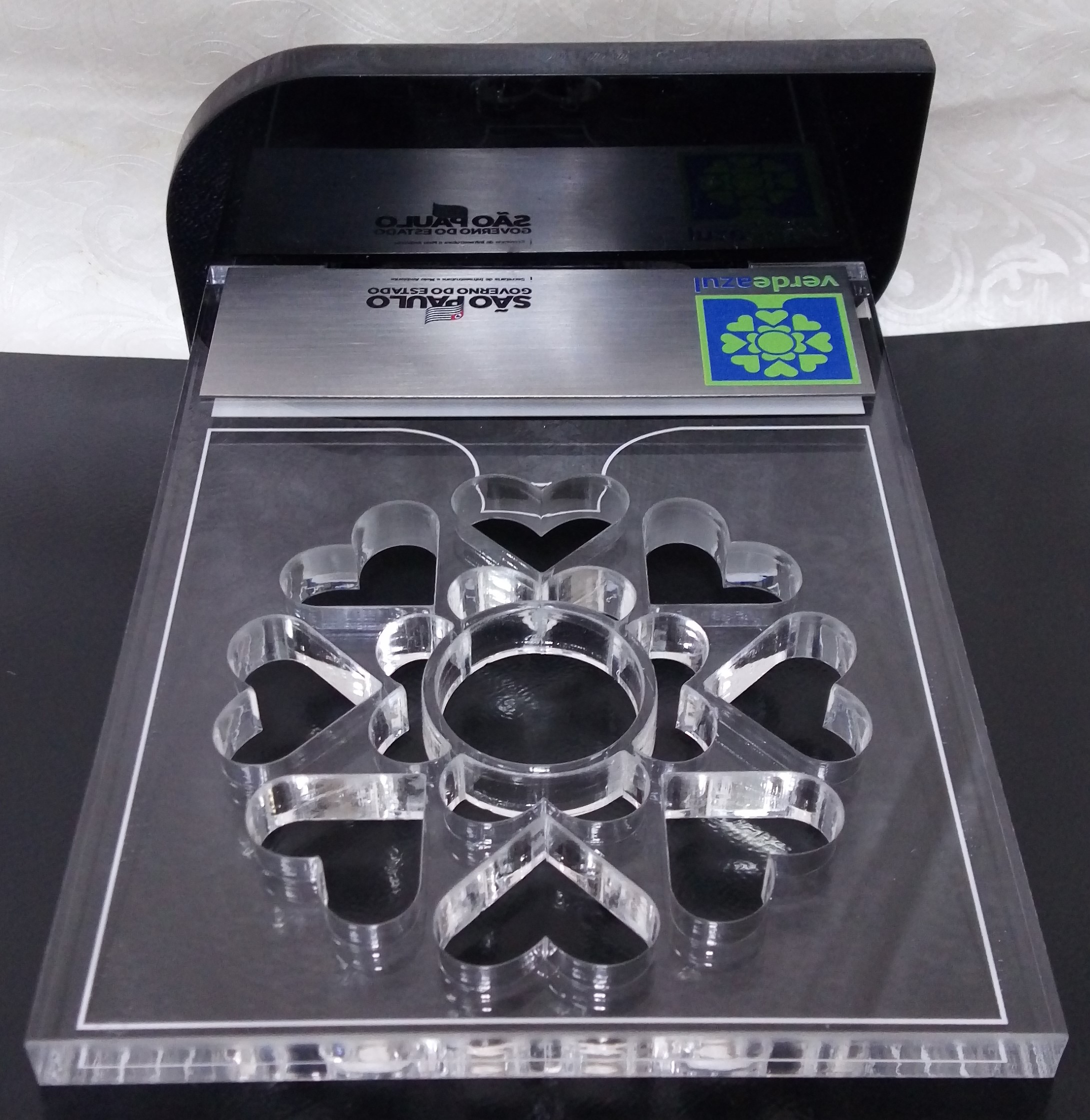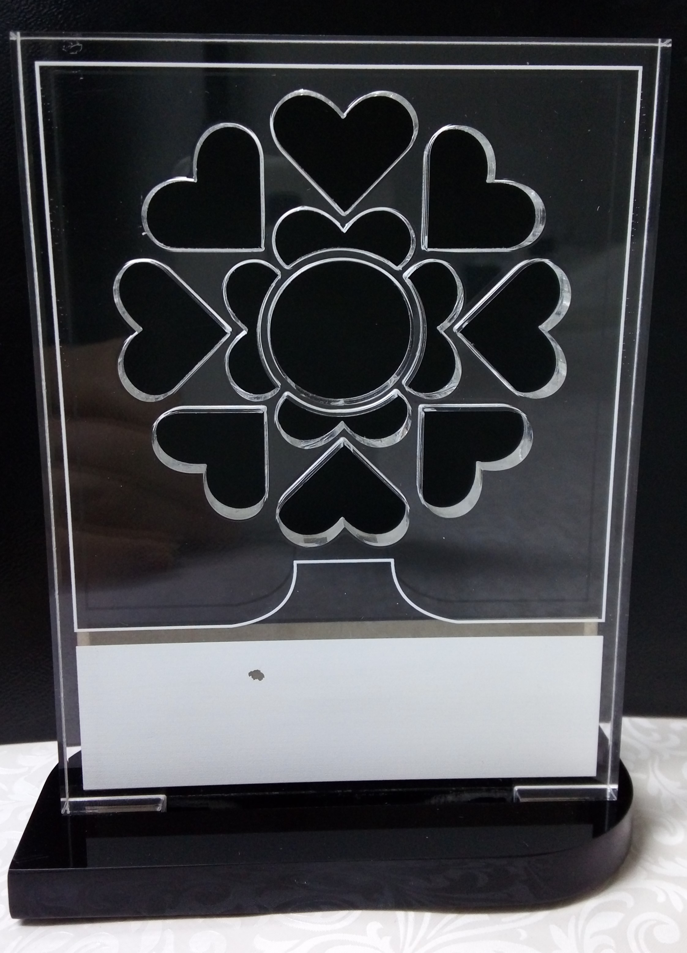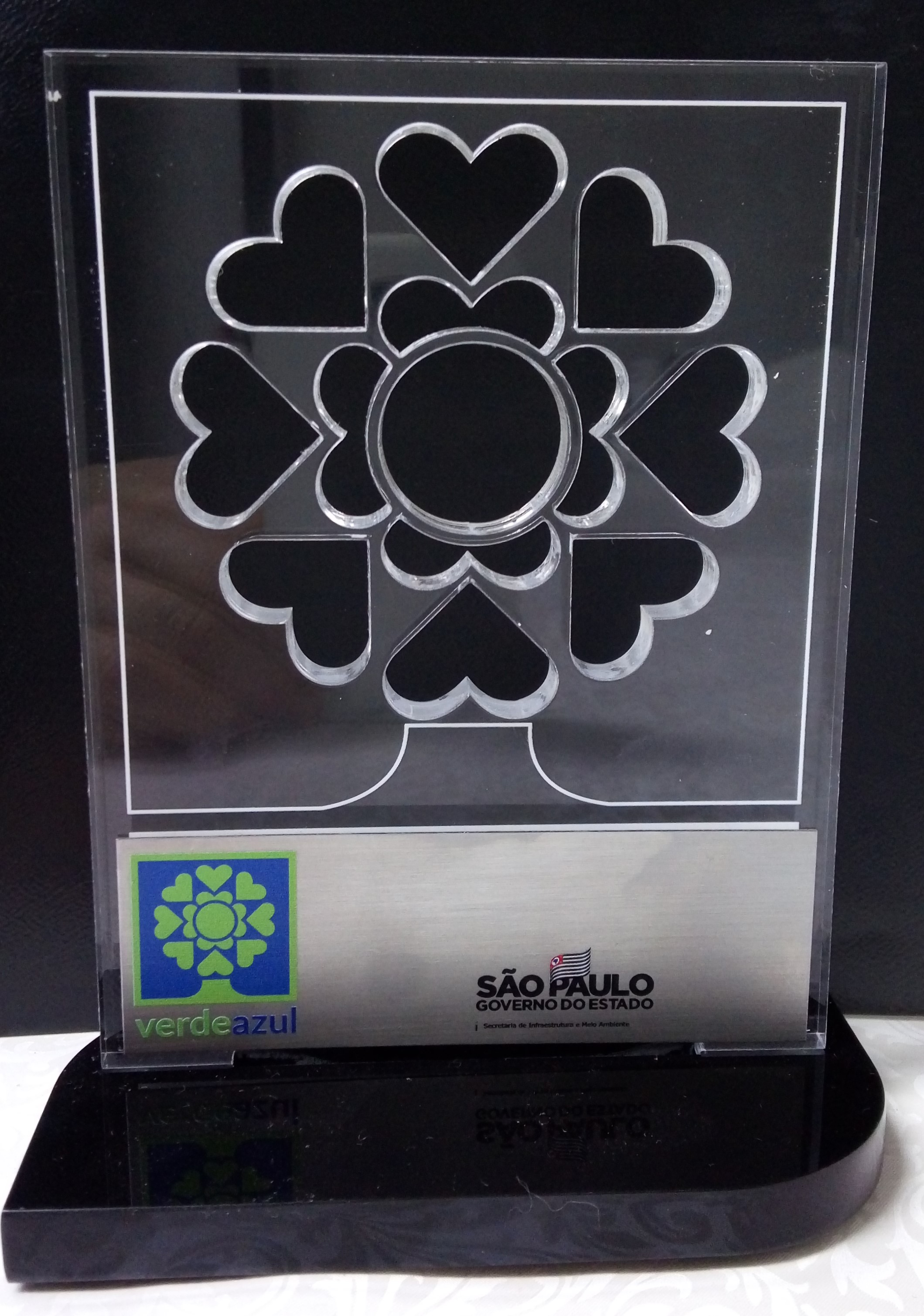 Transcrição: [Árvore em metal prateado, formada por 8 corações externos e flor central, colada a um tronco - anverso=verso] [Suporte da árvore similar a um tronco, pintado em azul - anverso=verso] [Base em madeira, pintura brilhante avermelhada na parte superior e laterais, frontal com etiqueta adesiva em fundo cinza, com inscrições, sob placa retangular branca em plástico rígido]: Prêmio Interlocutor Mais Antigo Pedreira [Base - parte inferior: etiqueta adesiva em papel branco, colada sob retângulo plastificado cor preta, brilhante]: ARONI Ind. Com. De Troféus E Medalhas Fonte: 11-4749-8215/11-96745624 www.aronitrofeus.com.br