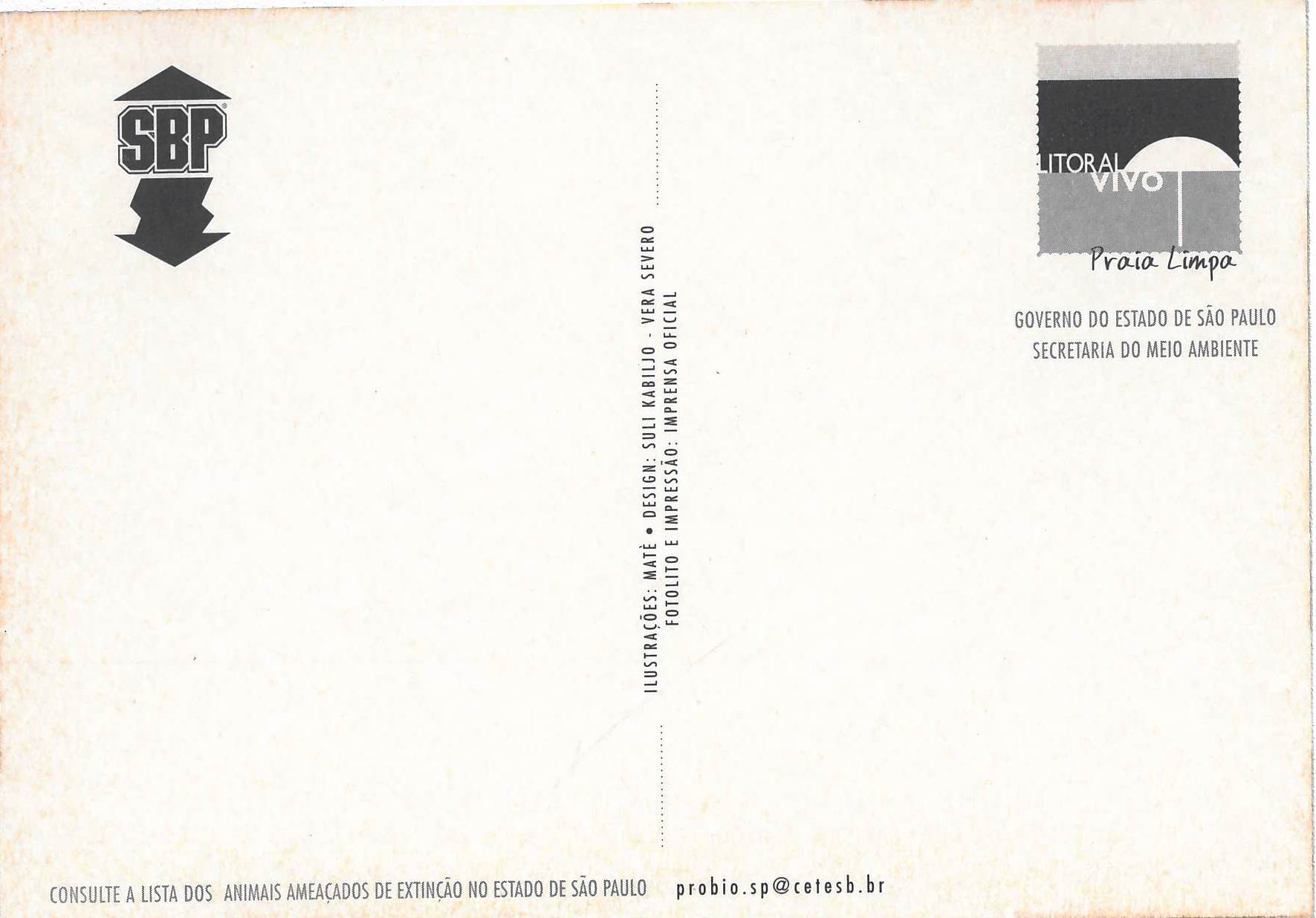 | Descrição | Anverso: imagem com borda desenhada, cor preto e branco, retângulo il. color., figura central: Pica-pau-rei Transcrição: Pica-pau-rei dryocopus galeatos Verso: parte superior esquerda. Transcrição: [Logo] SBT Sistema Brasileiro de Televisão. Parte central vertical. Transcrição: Ilustrações - Maté . Design - Sul Kabiljo. Vera Severo. Fotolito e impressão: Imprensa Oficial. Parte superior direita. Transcrição: [Logo] Litoral Vivo Praia limpa. Governo do Estado de São Paulo, Secretaria do Meio Ambiente. Parte inferior. Transcrição: Consulte a lista dos animais ameaçados de extinção no Estado de São Paulo. probio.sp@cetesb.br Imprensa Oficial |