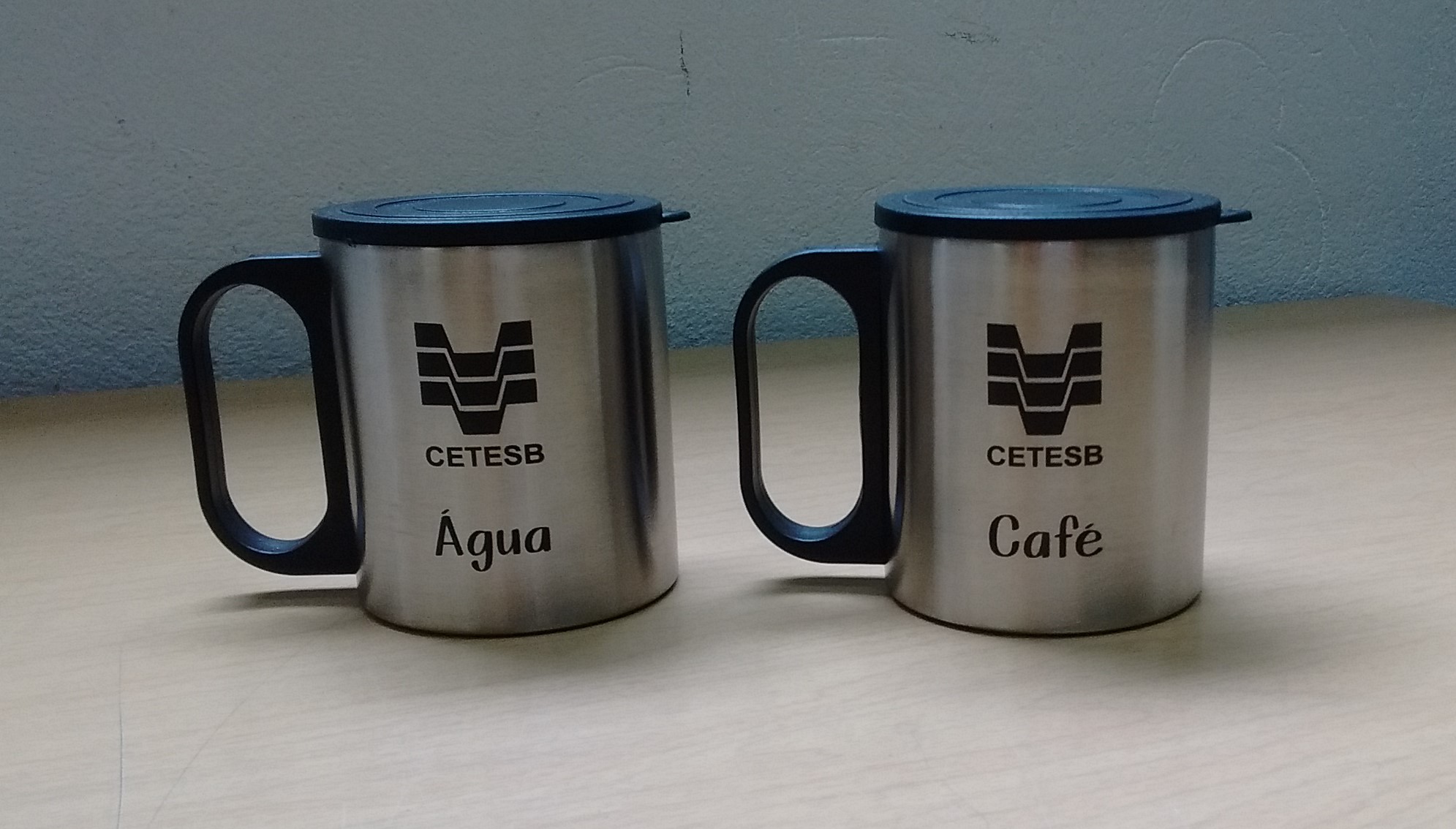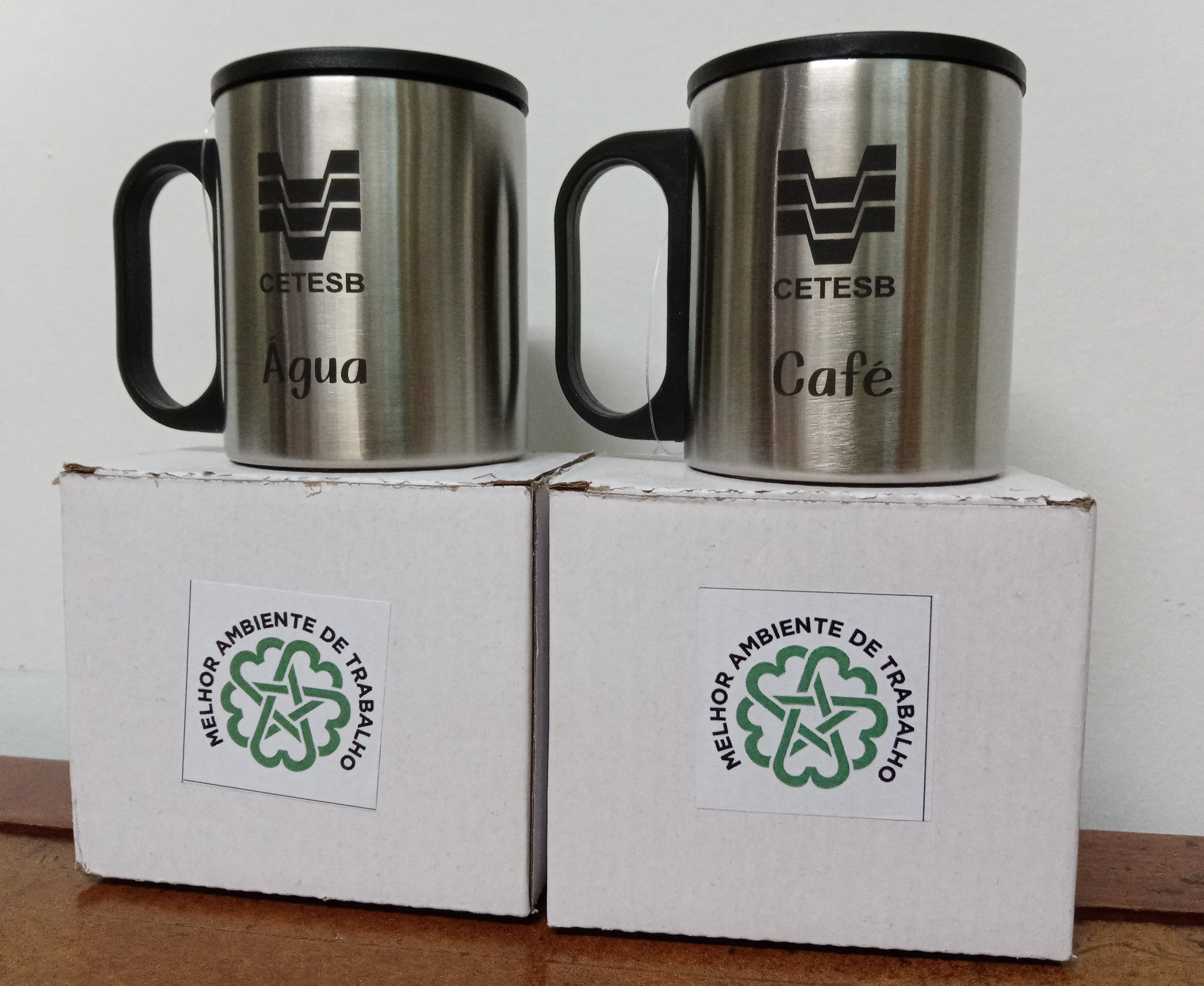 Peça 1: Transcrição: [Logo CETESB] Água Peça 2: Transcrição: [Logo CETESB] Café Caixa: [Símbolo] Melhor Ambiente de Trabalho