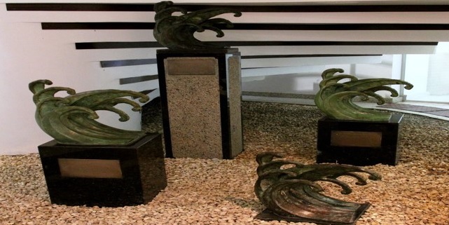 Transcrição (peças): OSNI BRANCO 85 Transcrição (placas): Prêmio "Meio Ambiente” do Governo do Estado de São Paulo Criado por iniciativa da Diretoria da Cetesb – Companhia De Tecnologia de Saneamento Ambiental, em 24 de junho de 1986 posteriormente assumido pelo Excelentíssimo Senhor Governador André Franco Montoro, pelo decreto nº 25.343 de 4 de junho de 1986, como distinção oficial do Governo do Estado de São Paulo à causa ambiental. Tema: Onda de Mar, criação do artista plástico Osni Branco, São Paulo