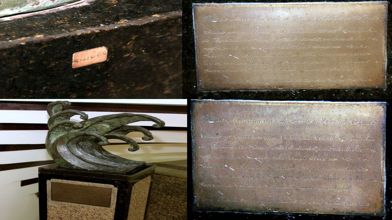 | Descrição | Transcrição (peças): OSNI BRANCO 85 Transcrição (placas): Prêmio "Meio Ambiente” do Governo do Estado de São Paulo Criado por iniciativa da Diretoria da Cetesb – Companhia De Tecnologia de Saneamento Ambiental, em 24 de junho de 1986 posteriormente assumido pelo Excelentíssimo Senhor Governador André Franco Montoro, pelo decreto nº 25.343 de 4 de junho de 1986, como distinção oficial do Governo do Estado de São Paulo à causa ambiental. Tema: Onda de Mar, criação do artista plástico Osni Branco, São Paulo | |