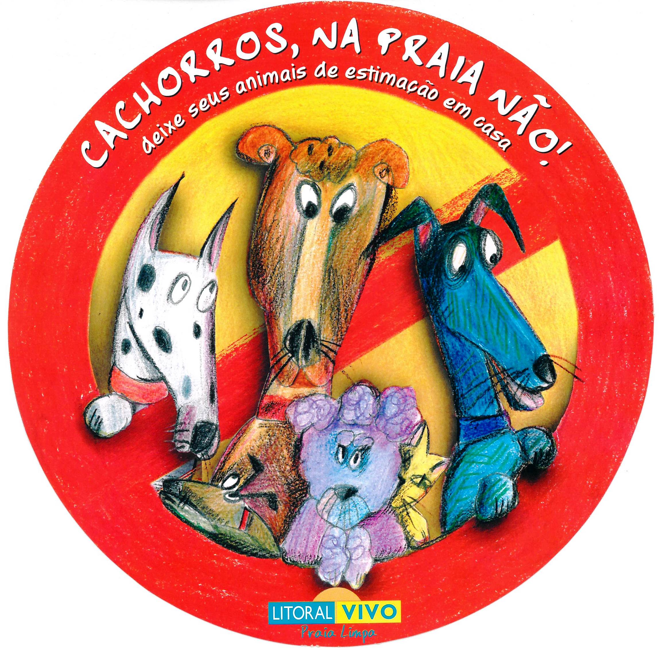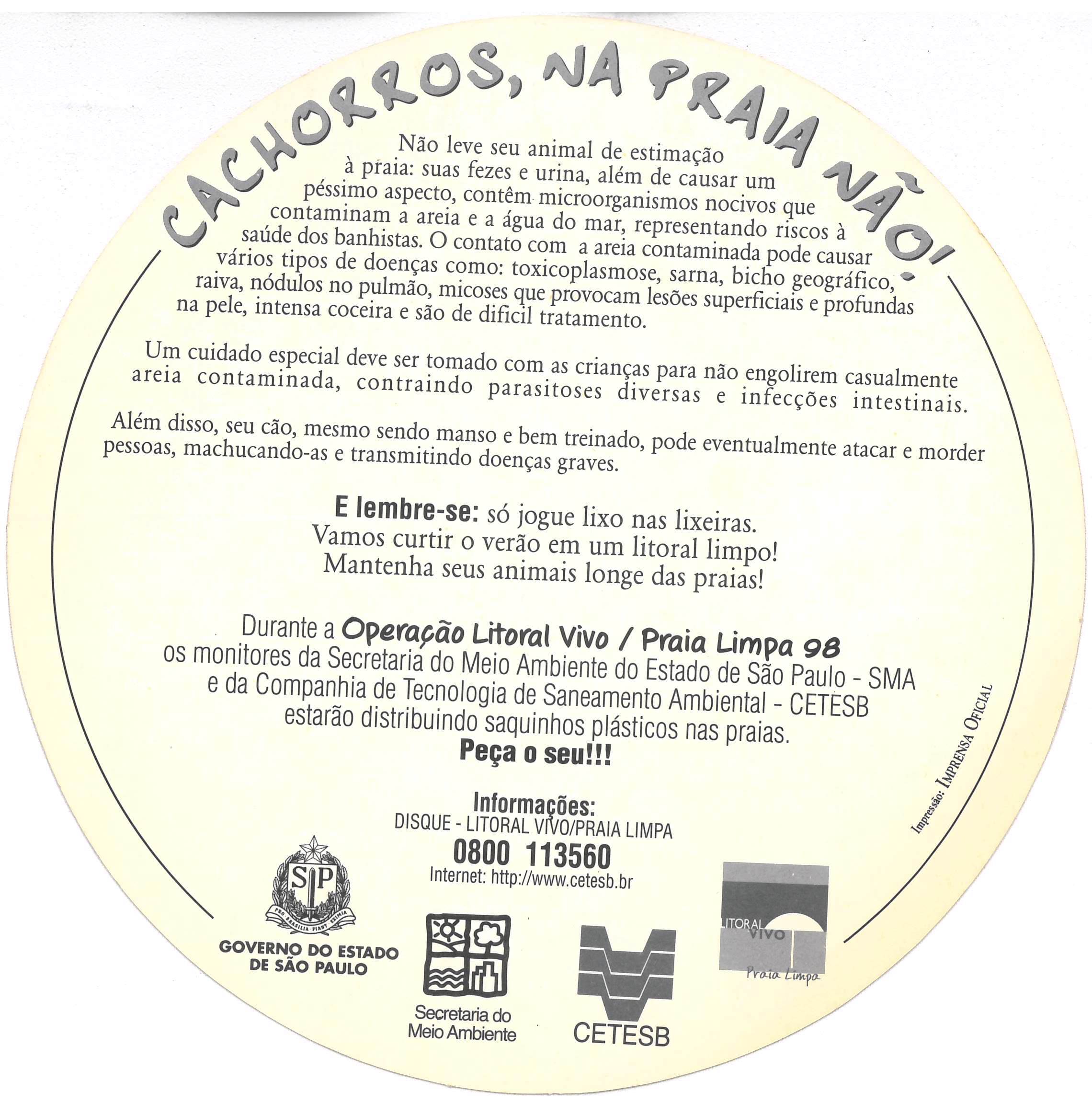 | Descrição | Panfleto 1: Anverso: borda fundo vermelho, inscrições cor branca, circular il. color., figura central: cães sobre o símbolo de proibido. Transcrição: Cachorros, na praia não! deixe seus animais de estimação em casa [logo] Litoral Vivo Praia Limpa Verso: texto parte superior. Parte inferior: [brasão SP] Governo do Estado de São Paulo [logo] Secretaria do Meio Ambiente [logo] CETESB [logo] Litoral vivo Praia Limpa Panfleto 2: Anverso: borda fundo vermelho, inscrições cor branca, circular il. color., figura central: cães sobre o símbolo de proibido. Transcrição: Cachorros, na praia não! deixe seus animais de estimação em casa Disque - Litoral Vivo/Praia Limpa 0800-113560 [logo] Secretaria do Meio Ambiente [brasão SP] Governo do Estado de São Paulo [Logo] CETESB [logo] Litoral Vivo Praia Limpa Internet: http://www.cetesb.br Verso: [branco] |