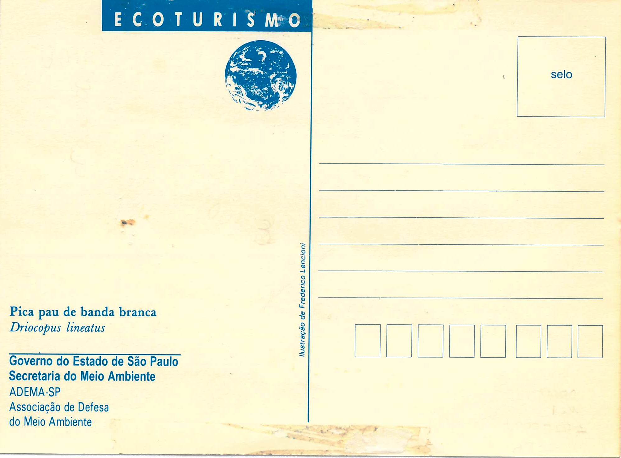 | Descrição | Anverso: imagem color., fundo branco, fig. central: Pica Pau Transcrição: [imagem Pica Pau de banda branca] Fred. Lencioni 88 Verso: Fundo branco, inscrições cor azul. Parte superior esquerda: Transcrição: Ecoturismo [logo globo] Parte inferior esquerda: Transcrição: Pica Pau de banda branca Driocopus lineatus Governo do Estado de São Paulo Secretaria do Meio Ambiente. ADEMA-SP Associação de Defesa do Meio Ambiente Parte lateral direita: Transcrição: [traçado quadrado] Selo [linhas horizontais] [8 traçados retangulares para CEP] Parte central vertical: Transcrição: Ilustração de Frederico Lencioni |