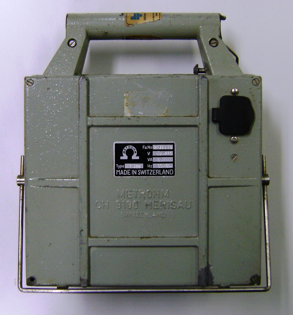 | Descrição | Transcrição: etiquetas, parte superior: [Logo] CETESB, Testado c/ Simulador - Utilizável, Rubrica 28-5-93, Av. Profº Frederico Hermann Jr., 345 - Pinheiros - São Paulo OS 2896 Transcrição: inscrição em alto relevo, verso: METROHM CH-9190 HERISEU Switzerland Transcrição: impresso em etiqueta, verso: METROHM Fa. nº 29/4140 V 117-240 VA 5 Hz 50-60 Type E488 MADE IN SWITZERLAND |