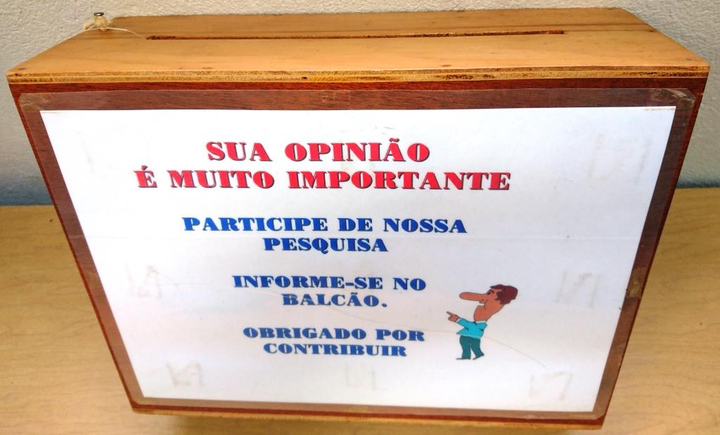 | Descrição | Transcrição: Sua opinião é muito importante Participe de nossa pesquisa Informe-se no balcão. Obrigado por contribuir Fig. masculina | |