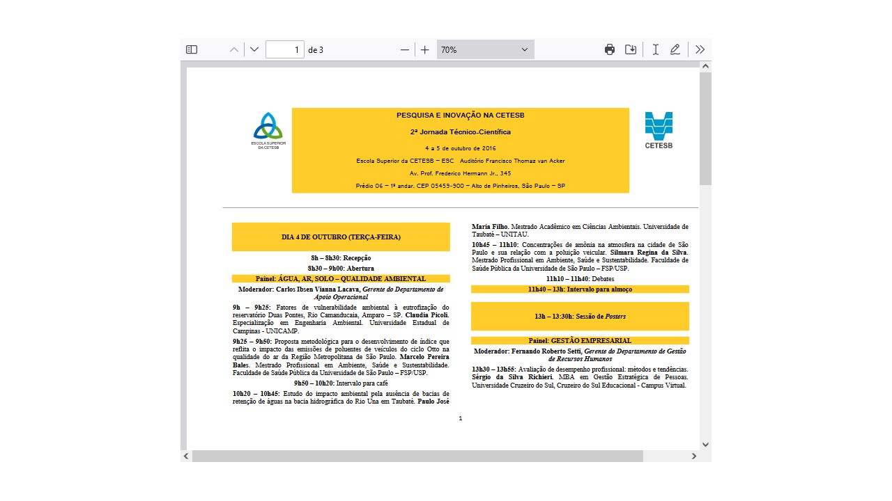 | Autor(es) Secundário | Jornada Técnico-Científica da CETESB, 02, São Paulo, 4-5 out. 2016 | |