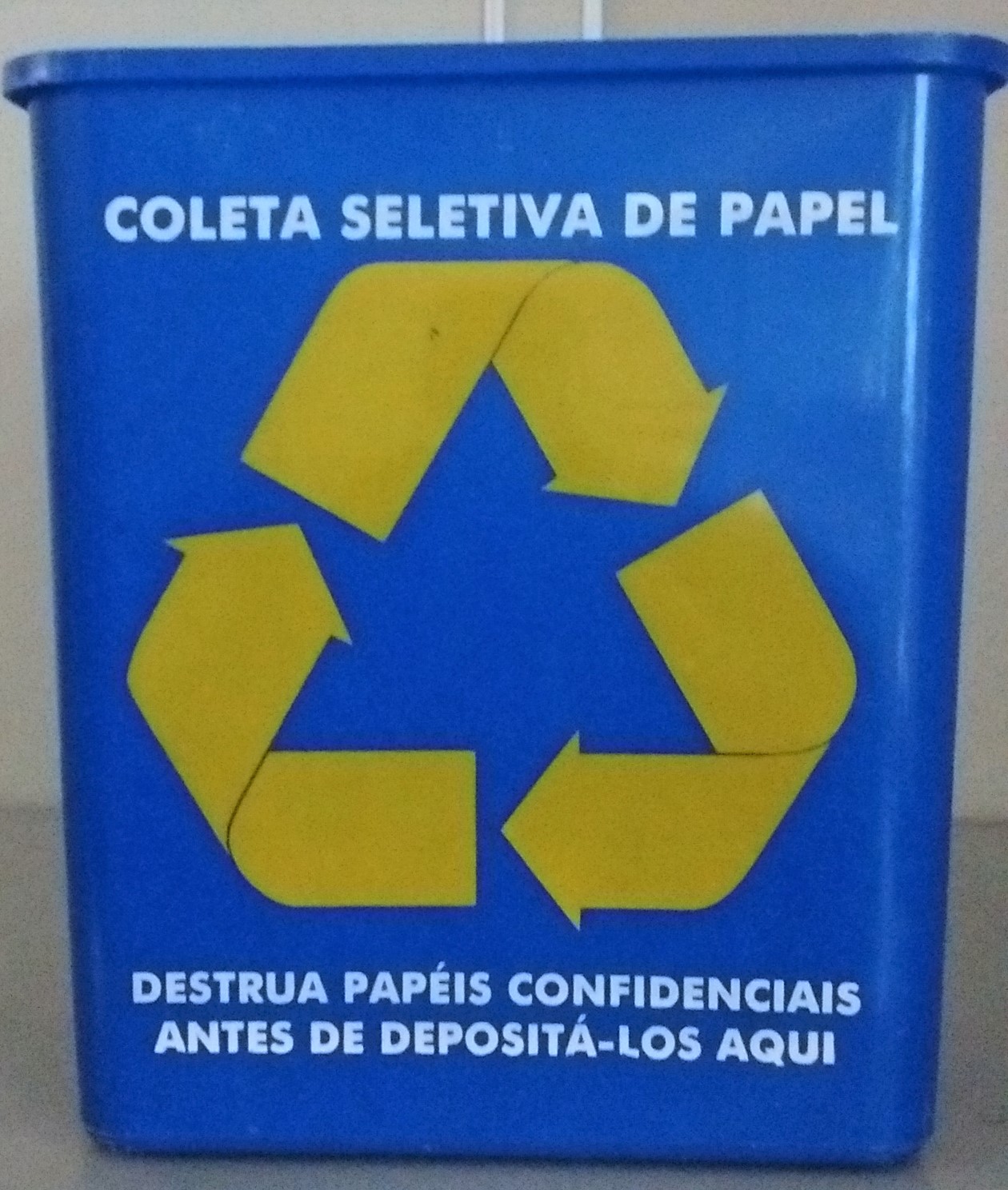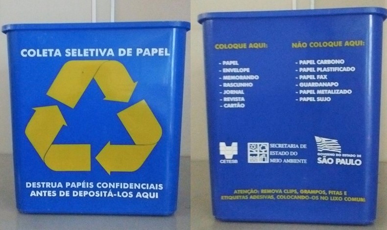INSCRIÇÕES no ANVERSO: COLETA SELETIVA DE PAPEL (branco) Símbolo da reciclagem (amarelo) Destrua papéis confidenciais antes de depositá-los aqui INSCRIÇÕES no VERSO: Coloque aqui (amarelo): papel, envelope, memorando, rascunho, jornal, revista, cartão (branco) Não coloque aqui (amarelo): papel carbono, papel plastificado, papel fax, guardanapo, papel metalizado, papel sujo (branco) (Logos cor branca) CETESB, Secretaria de Estado do Meio Ambiente, Governo do Estado de São Paulo (frase em amarelo) Atenção: remova clips, grampos, fitas e etiquetas adesivas, colocando-os no lixo comum INSCRIÇÃO na base INFERIOR: (em relevo) KAPLAS (dentro de moldura retangular) Indústria brasileira 640921