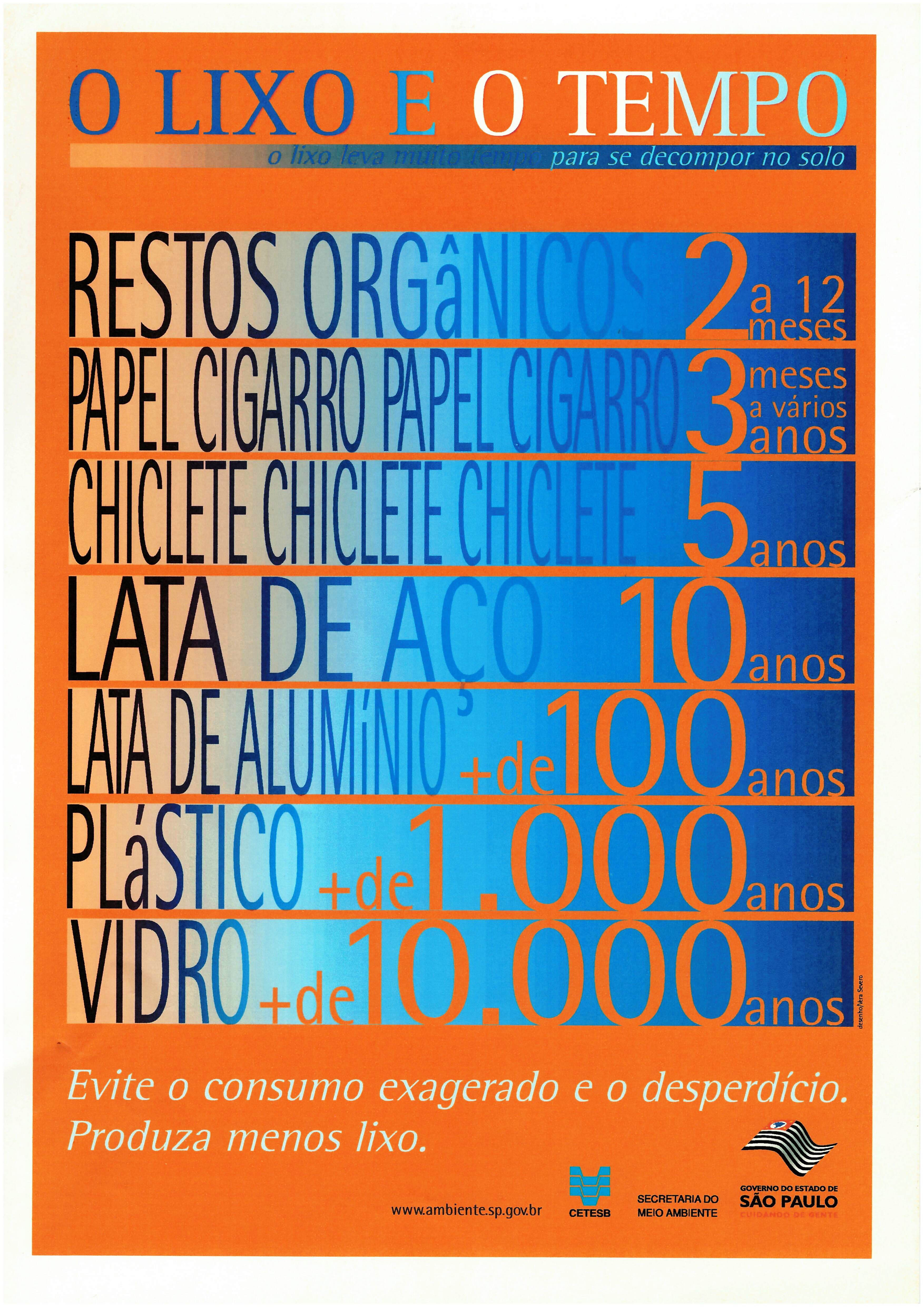 Transcrição: [Anverso] O lixo e o tempo o lixo leva muito tempo para se decompor no solo Restos orgânicos 2 a 12 meses Papel Cigarro [...]